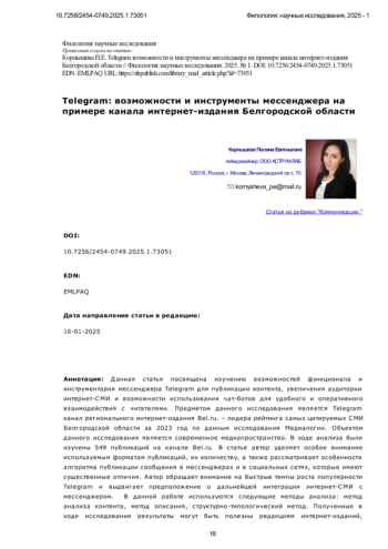 Данная статья посвящена изучению возможностей функционала и инструментария мессенджера Telegram для публикации контента, увеличения аудитории интернет-СМИ и возможности использования чат-ботов для удобного и оперативного взаимодействия с читателями. Предметом данного исследования является Telegram канал регионального интернет-издания Bel. ru. - лидера рейтинга самых цитируемых СМИ Белгородской области за 2023 год по данным исследования Медиалогии. Объектом данного исследования является современное медиапространство. В ходе анализа были изучены 549 публикаций на канале Bel. ru. В статье автор уделяет особое внимание используемым форматам публикаций, их количеству, а также рассматривает особенности алгоритма публикации сообщения в мессенджерах и в социальных сетях, которые имеют существенные отличия. Автор обращает внимание на быстрые темпы роста популярности Telegram и выдвигает предположение о дальнейшей интеграции интернет-СМИ с мессенджером. В данной работе используются следующие методы анализа: метод анализа контента, метод описания, структурно-типологический метод. Полученные в ходе исследования результаты могут быть полезны редакциям интернет-изданий, планирующим создание канала в мессенджере Telegram или уже имеющим такой канал. Проведенный анализ позволяет сделать вывод о том, что современное интернет-издание использует множество доступных инструментов для создания разнообразного контента, взаимодействия с аудиторией и увеличения ее охвата. В свою очередь, мессенджер Telegram отвечает требованиям интернет-изданий, в частности, предлагая широкий выбор форматов публикаций и возможностью настройки чат-ботов. Автор исследования приходит к выводу, что редакции интернет-изданий, стремящиеся расширить свою аудиторию, могут использовать возможности мессенджера для увеличения присутствия в информационном пространстве, а также увеличения охватов публикаций и дополнительной монетизации.