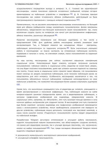 9. 	Махорт А. К., Синенко П. Д. Telegram как уникальная площадка индустрии мессенджеров // Огарев-online. 2021. № 2. URL: https://journal.mrsu.ru/arts/telegram-kak-unikalnaya-ploshhadka-industrii-messendzherov.