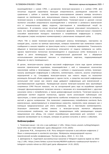 2. 	Дядченко М.В., Холодилина А.Ю. Роль telegram-каналов в российском инфополе // Язык и коммуникация в контексте культуры. Материалы международной научно-практической онлайн-конференции. Ростов-на-Дону, 2022. С. 311-316.