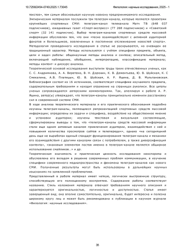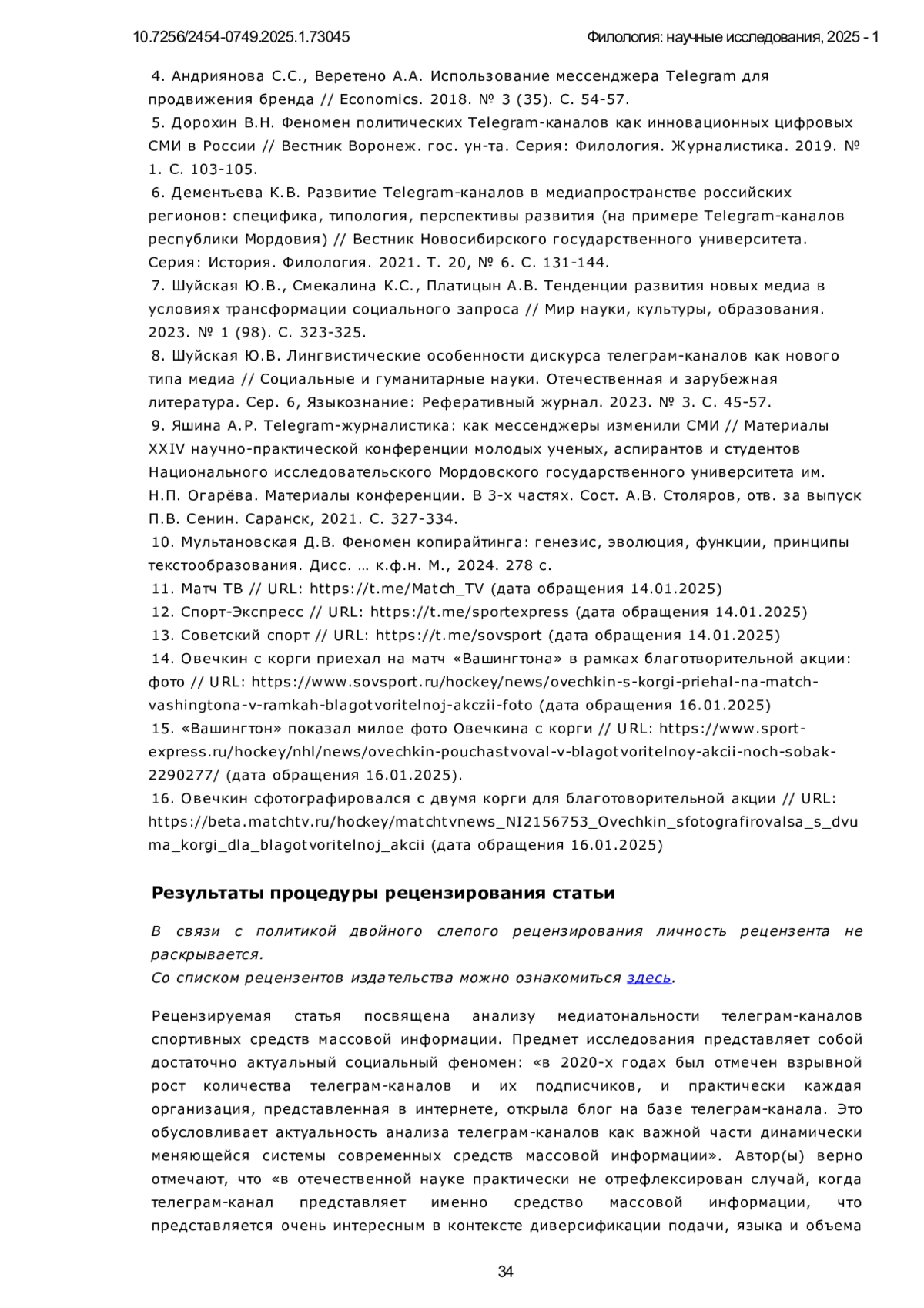 8. 	Шуйская Ю.В. Лингвистические особенности дискурса телеграм-каналов как нового типа медиа // Социальные и гуманитарные науки. Отечественная и зарубежная литература. Сер. 6, Языкознание: Реферативный журнал. 2023. № 3. С. 45-57.