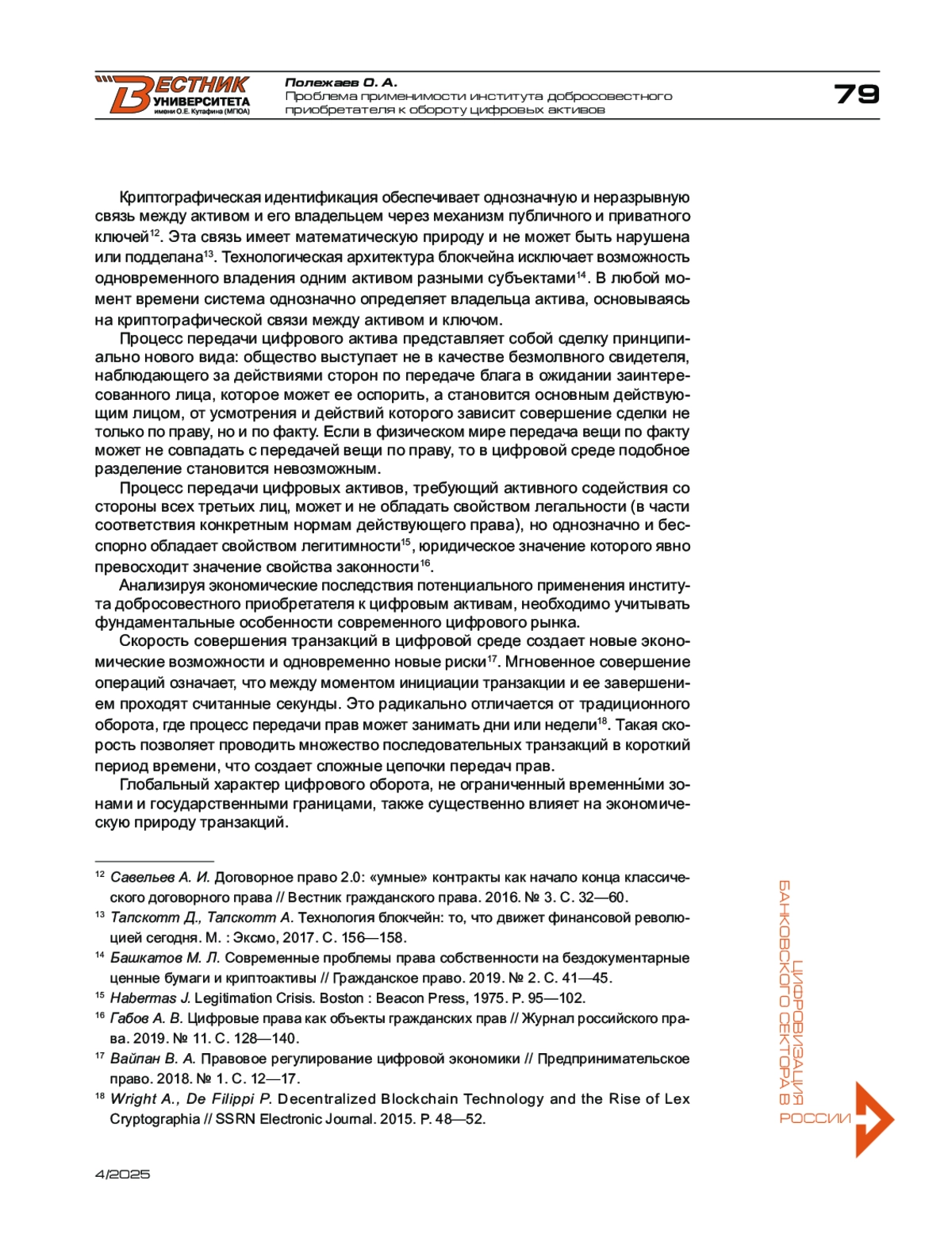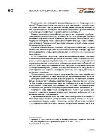 11. Федоров Д. В. Токены, криптовалюта и смарт-контракты в отечественных законопроектах с позиции иностранного опыта // Вестник гражданского права. - 2018. - № 2. - С. 30-74.