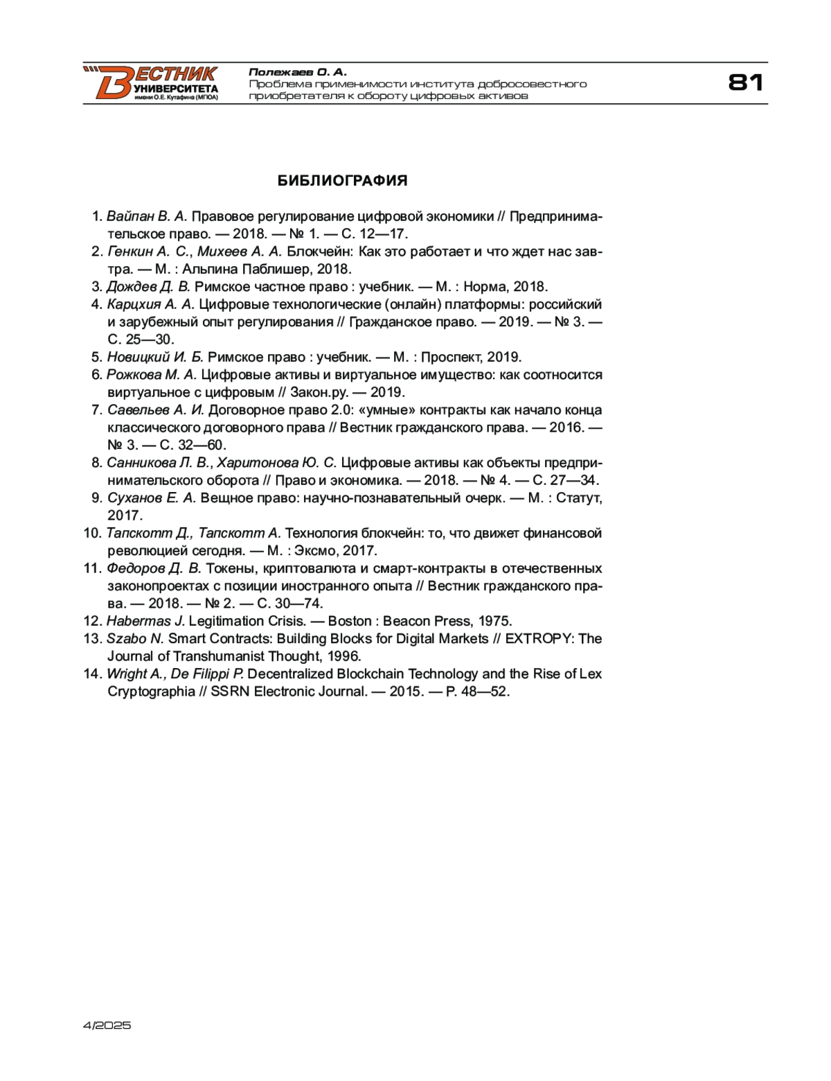1. Вайпан В. А. Правовое регулирование цифровой экономики // Предпринимательское право. - 2018. - № 1. - С. 12-17.