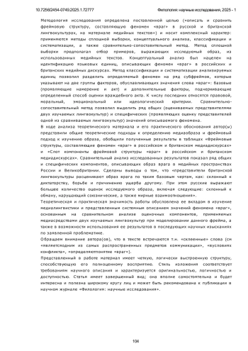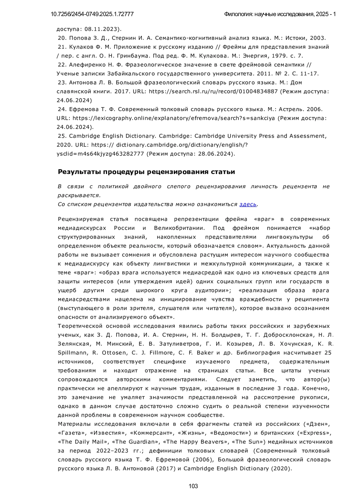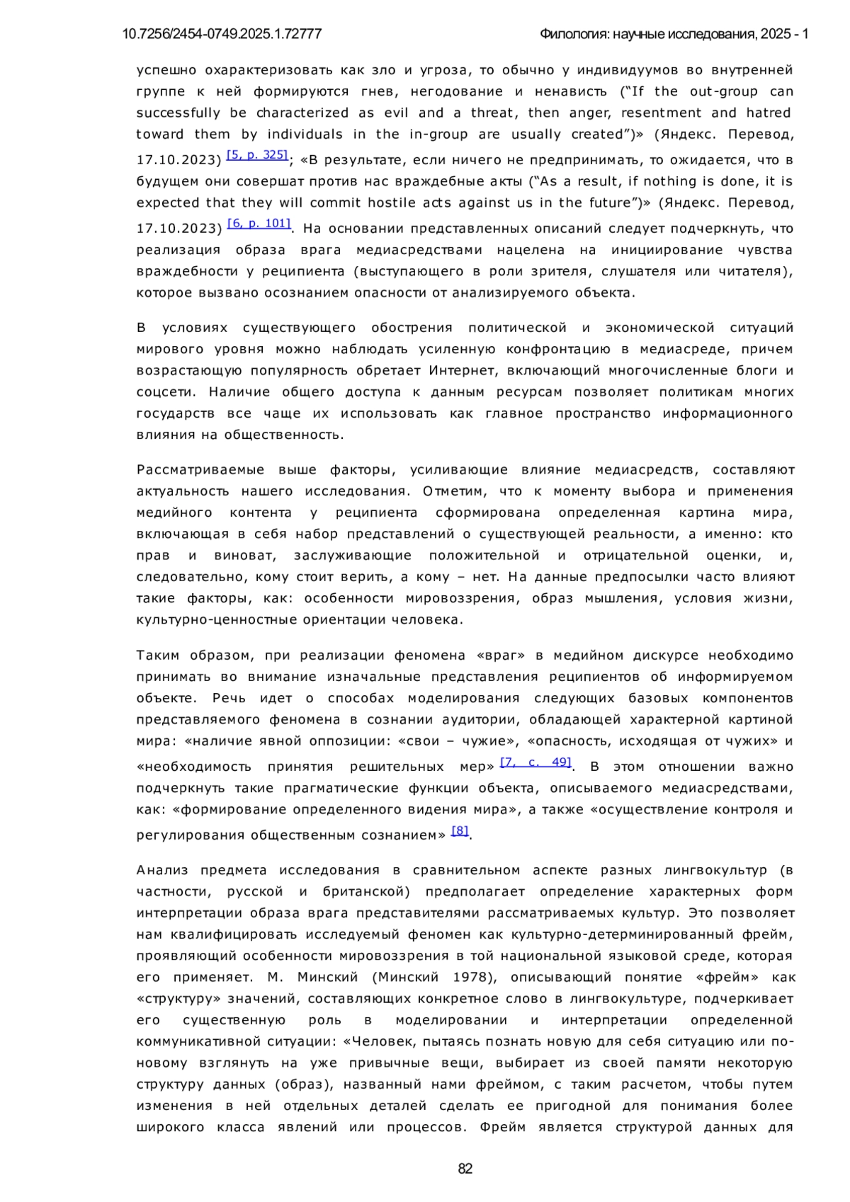 Предметом исследования является феномен “враг” в медийных дискурсах русской и британской лингвокультур. Актуальность предмета исследования связана с усиленной конфронтацией в медиасреде, вызываемой обострением политической и экономической ситуаций мирового уровня. При этом возрастающую популярность обретает Интернет, наличие общего доступа к которому позволяет политикам многих государств все чаще его использовать как главное пространство информационного влияния на общественность. Цель исследования - описать и сравнить смысловые компоненты, которые определяют образ врага в двух анализируемых лингвокультурах, на материале использованных медийных текстов. Сравнительное описание исследуемого феномена в разных лингвокультурах позволяет его квалифицировать как культурно-детерминированный фрейм, проявляющий особенности мировоззрения в той национальной языковой среде, которая его применяет. В работе применялись такие исследовательские методы, как: сплошной выборки, концептуального анализа, классификации и систематизации анализируемых языковых единиц на смысловые компоненты и сравнительно-сопоставительный метод. По результатам исследования, были выделены две группы компонентов, составляющих значения слова «враг» в анализируемых лингвокультурах, такие как: слот-компоненты, описывающие базовые оценочные черты, и терминалы, выражаемые определенными языковыми единицами в представляемой коммуникативной ситуации, которая упоминает данный феномен. Согласно наблюдениям, компоненты второй названной группы обуславливают первые. Выделенные слот-компоненты описываемого феномена проявили ряд субфреймов, определяющих предмет исследования по двум основополагающим факторам, таким как: базовые (проявляющие намерение и акт) и дополнительные. Последние указывают на различные способы оценки враждебного акта, включая следующие: правовой, моральный, эмоциональный или идеологический критерии. Полученные данные показали ряд общих (расцениваемых представителями обеих лингвокультур) и специфических (проявляющих оценку представителями одной из исследованных лингвокультур) компонентов изучаемого феномена.