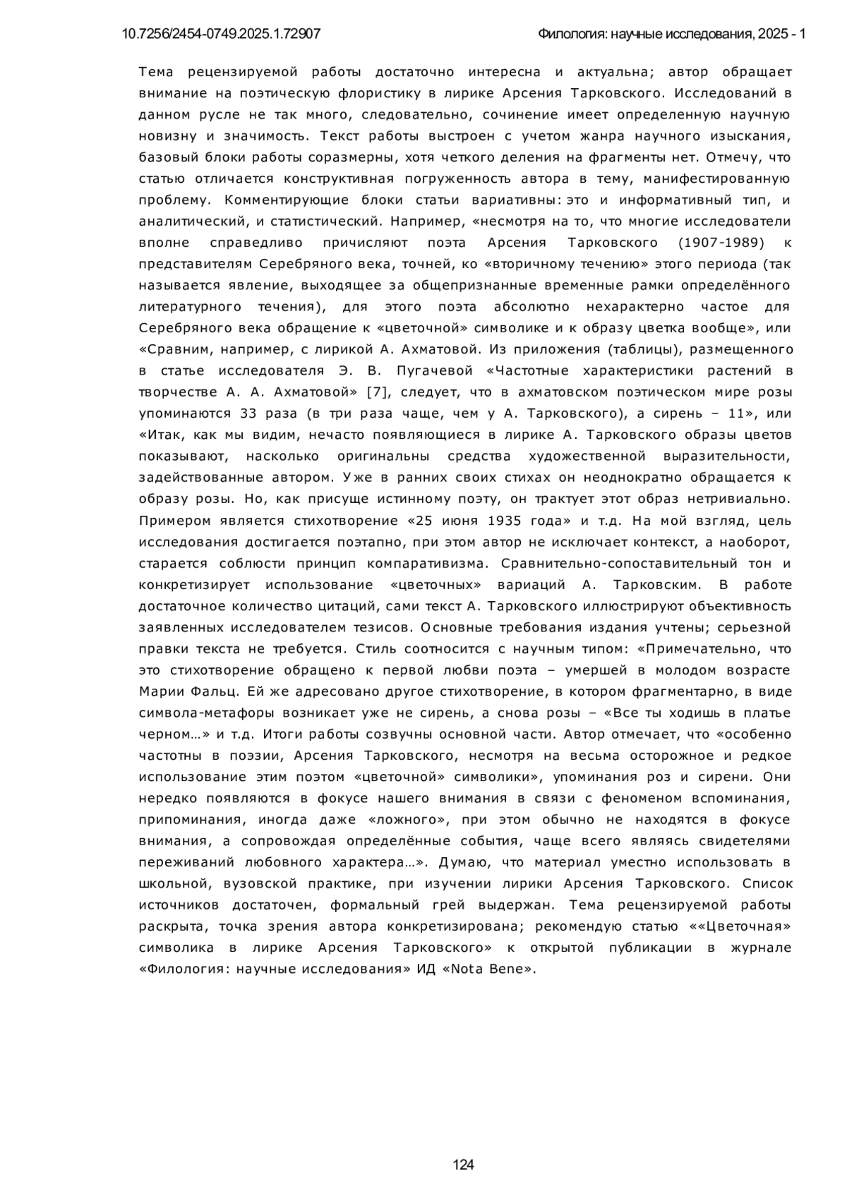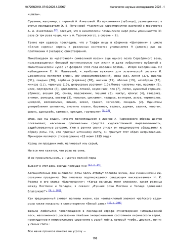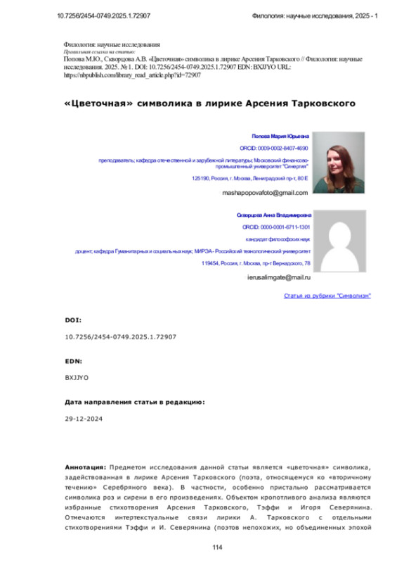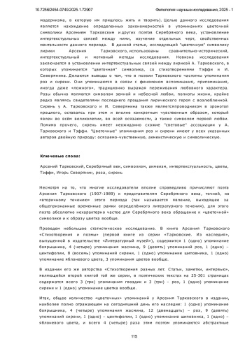 Предметом исследования данной статьи является «цветочная» символика, задействованная в лирике Арсения Тарковского (поэта, относящемуся ко «вторичному течению» Серебряного века). В частности, особенно пристально рассматривается символика роз и сирени в его произведениях. Объектом кропотливого анализа являются избранные стихотворения Арсения Тарковского, Тэффи и Игоря Северянина. Отмечаются интертекстуальные связи лирики А. Тарковского с отдельными стихотворениями Тэффи и И. Северянина (поэтов непохожих, но объединенных эпохой модернизма, в которую им пришлось жить и творить). Целью данного исследования является нахождение определенных закономерностей в упоминаниях цветочной символики Арсением Тарковским и других поэтов Серебряного века, установление интертекстуальных связей между ними, изучение отдельных черт, свойственных ментальности данного периода. В данной статье, исследующей “цветочную” символику лирики Арсения Тарковского, использованы сравнительно-исторический, интертекстуальный и мотивный методы исследования. Новизна исследования заключается в установлении интертекстуальных связей между лирикой А. Тарковского, в которых упоминается “цветочная” символика, со стихотворениями Тэффи и И. Северянина. Делаются выводы о том, что в поэзии Тарковского частотны упоминания роз и сирени. Они упоминаются в связи с феноменом вспоминания, припоминания, иногда даже «ложного», традиционно выражая переживания любовного характера. Розы обычно являются символом земной и небесной любви, полноты жизни, крайне редко являясь свидетелями последнего прощания лирического героя с возлюбленной. Сирень у А. Тарковского и И. Северянина также является проводником в хронотоп прошлого, оставаясь при этом и вполне конкретным чувственным образом, который явлен во всём великолепии, во всей осязаемости, а также символом первой любви. Помимо прочего, сирень имеет неожиданно схожие “световые” ассоциации у А. Тарковского и Тэффи. “Цветочные” упоминания роз и сирени имеют у всех указанных авторов двойную природу: осязаемо-чувственную, акмеистическую и символическую.