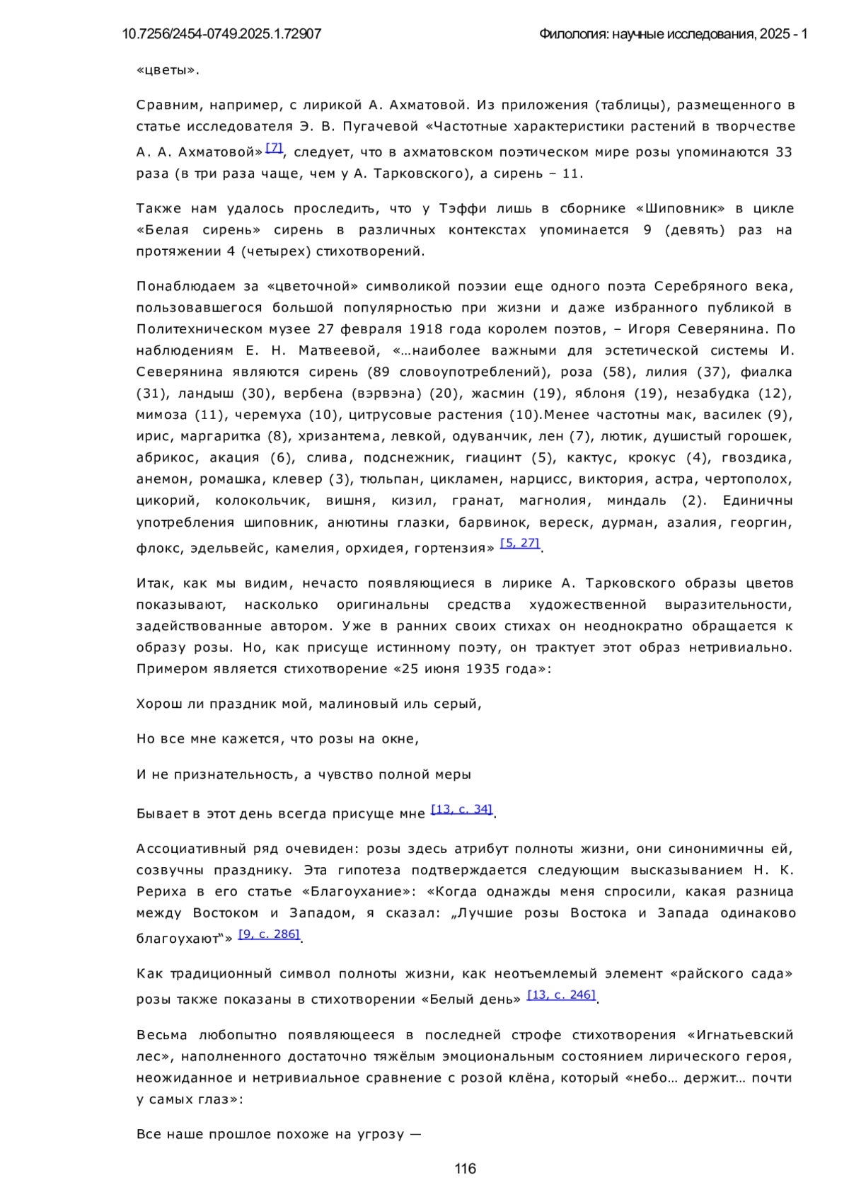 7. 	Пугачева Э. В. Частотные характеристики растений в творчестве А. А. Ахматовой // Материалы ХV конференции по философии техники и технетике и семинара по ценологии (Москва, 19 ноября 2010 г.). Вып. 47. “Ценологические исследования”. М.: Технетика, 2011. 400 с. URL: http://www.kudrinbi.ru/public/30511/index.htm.