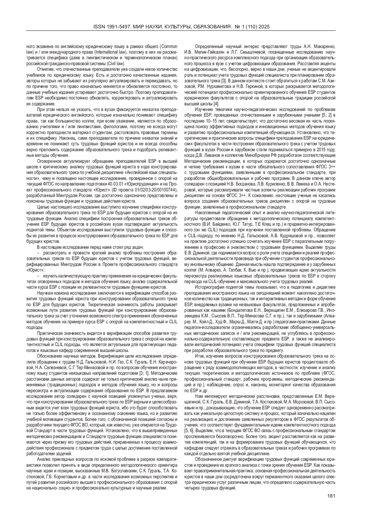 Сегодня языковые кафедры вузов достаточно активно занимаются вопросом верификации содержания образования с учетом последних вызовов времени, требований государства и рынка труда. Установлено, что разработчики последнего Федерального государственного образовательного стандарта высшего образования рекомендуют вузам опираться на трудовые функции специалиста, верифицированные в Профессиональном стандарте, в ом числе при разработке образовательных треков по учебным дисциплинам. Поэтому целью настоящего исследования выступило изучение специфики конструирования образовательного трека по английскому языку специальности для будущих юристов с опорой на их трудовые функции. Автор статьи представляет накопленный опыт конструирования такового на примере Финансового университета г. Москва. Анализ научных работ педагогов-исследователей и накопленного педагогического опыта преподавания языка специальности позволил установить, что в ходе конструирования образовательного трека возможно опираться на четыре трудовые функции юриста, заявленные в Проекте профессионального стандарта «Юрист», содержательную составляющую которых следует отражать как в содержании трека, так и при верификации подходов (компетентностный и CLIL) и методов обучения языку. Приводятся фрагменты занятий по языку, раскрывающие содержание трудовых функций юриста, с опорой на метод проектов, метод «перевернутого класса», «Moot court», кейс метод и IRAC метод. Полученные результаты свидетельствуют об эффективности проделанной работы в исследуемой области и позволяют наметить возможные перспективные направления развития в обозначенной области, в частности: открытие актуальных направлений подготовки обучающихся вузов, релевантных последним тенденциям развития рынка труда и т. д.