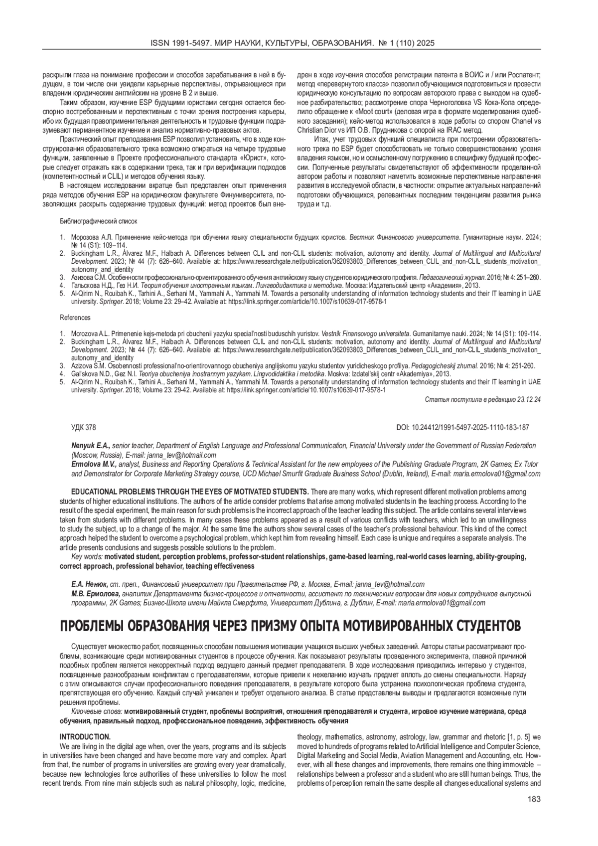В представленной работе анализируется специфика профессионального коммуникативного подхода в обучении будущих юристов, методы и подходы к развитию юридико-коммуникативной компетентности у студентов юридических вузов. Основная идея статьи заключается в том, что юридико-коммуникативная компетентность представляет собой важный показатель успеха будущих юристов в профессиональной среде. Авторы отмечают, что для формирования этой компетентности необходимо учитывать, как профессиональные знания и навыки, так и коммуникативные способности и ценностные ориентации студентов. Статья подчеркивает важность интегративной модели обучения, которая объединяет теоретические и практические аспекты, а также акцентирует внимание на необходимости использования междисциплинарного подхода в преподавании, охватывающего психологию, конфликтологию, риторику и другие дисциплины. Комплексный подход к развитию юридико-коммуникативной компетентности способствует формированию профессионализма будущих юристов. Логическим завершением работы является выделение условий, необходимых для успешной реализации модели юридико-коммуникативной компетентности, таких как правовая грамотность, коммуникативные навыки, умение вести переговоры и соблюдать этические нормы и др. Результаты исследования способствуют дополнению и обновлению научных представлений о важности коммуникативной компетентности для юристов и служат практическим руководством для педагогов, стремящихся повысить качество подготовки будущих специалистов в области права.
