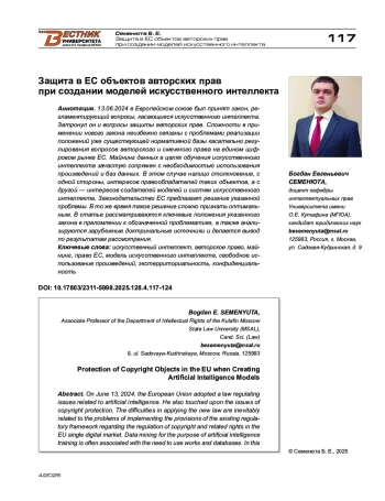 13.06.2024 в Европейском союзе был принят закон, регламентирующий вопросы, касающиеся искусственного интеллекта. Затронул он и вопросы защиты авторских прав. Сложности в применении нового закона неизбежно связаны с проблемами реализации положений уже существующей нормативной базы касательно регулирования вопросов авторского и смежного права на едином цифровом рынке ЕС. Майнинг данных в целях обучения искусственного интеллекта зачастую сопряжен с необходимостью использования произведений и баз данных. В этом случае налицо столкновение, с одной стороны, интересов правообладателей таких объектов, а с другой — интересов создателей моделей и систем искусственного интеллекта. Законодательство ЕС предлагает решение указанной проблемы. В то же время такое решение сложно признать оптимальным. В статье рассматриваются ключевые положения указанного закона в преломлении к обозначенной проблематике, а также анализируются зарубежные доктринальные источники и делается вывод по результатам рассмотрения.