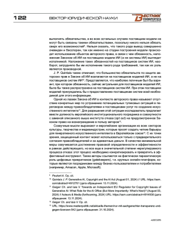 4. Quintais J. P. Generative AI, Copyright and the AI Act (August 01, 2024) // URL: https://ssrn.com/abstract=4912701 (дата обращения: 13.11.2024).