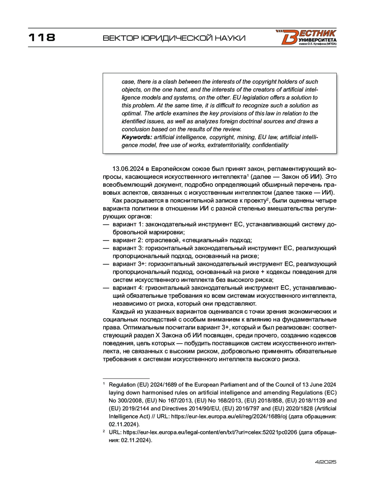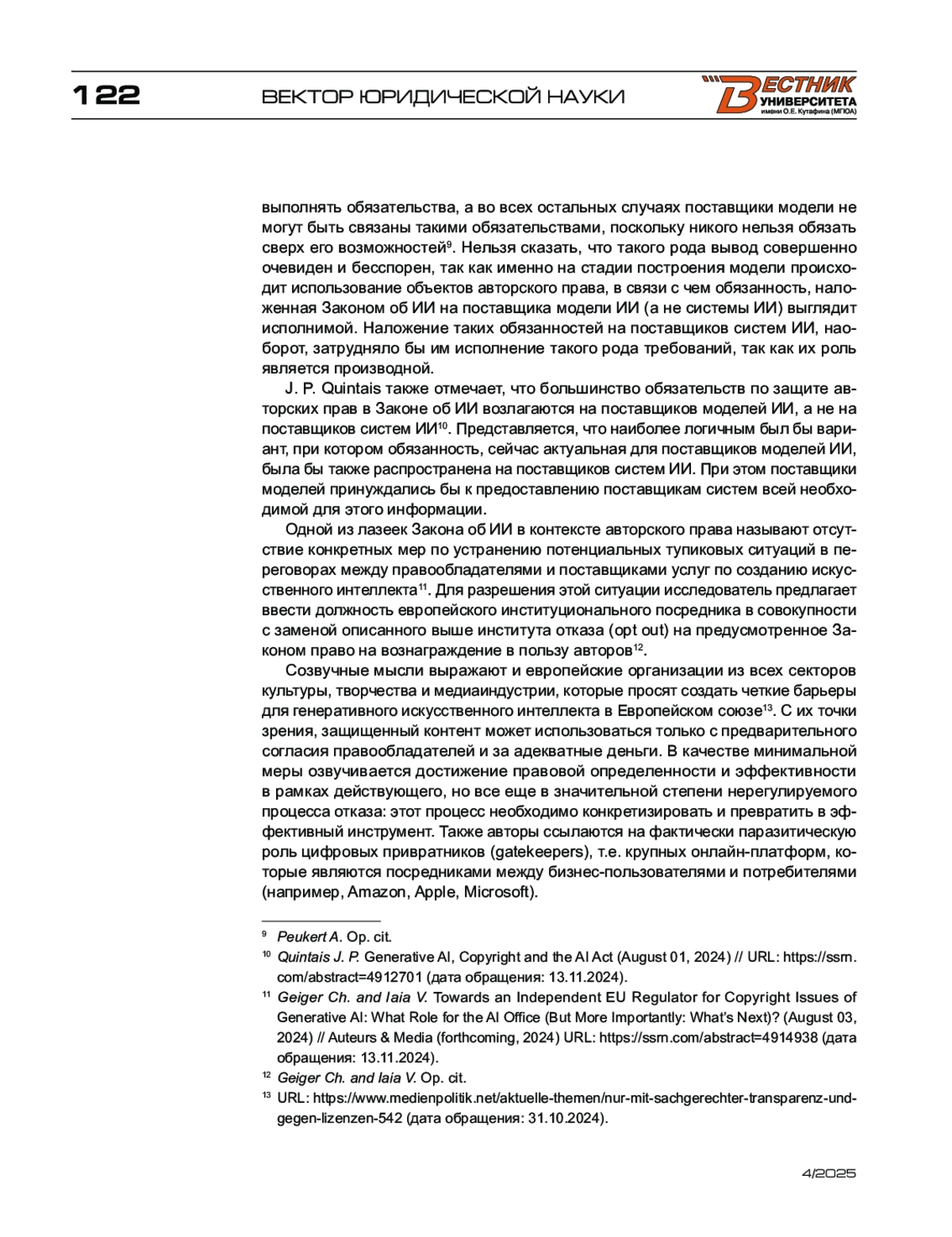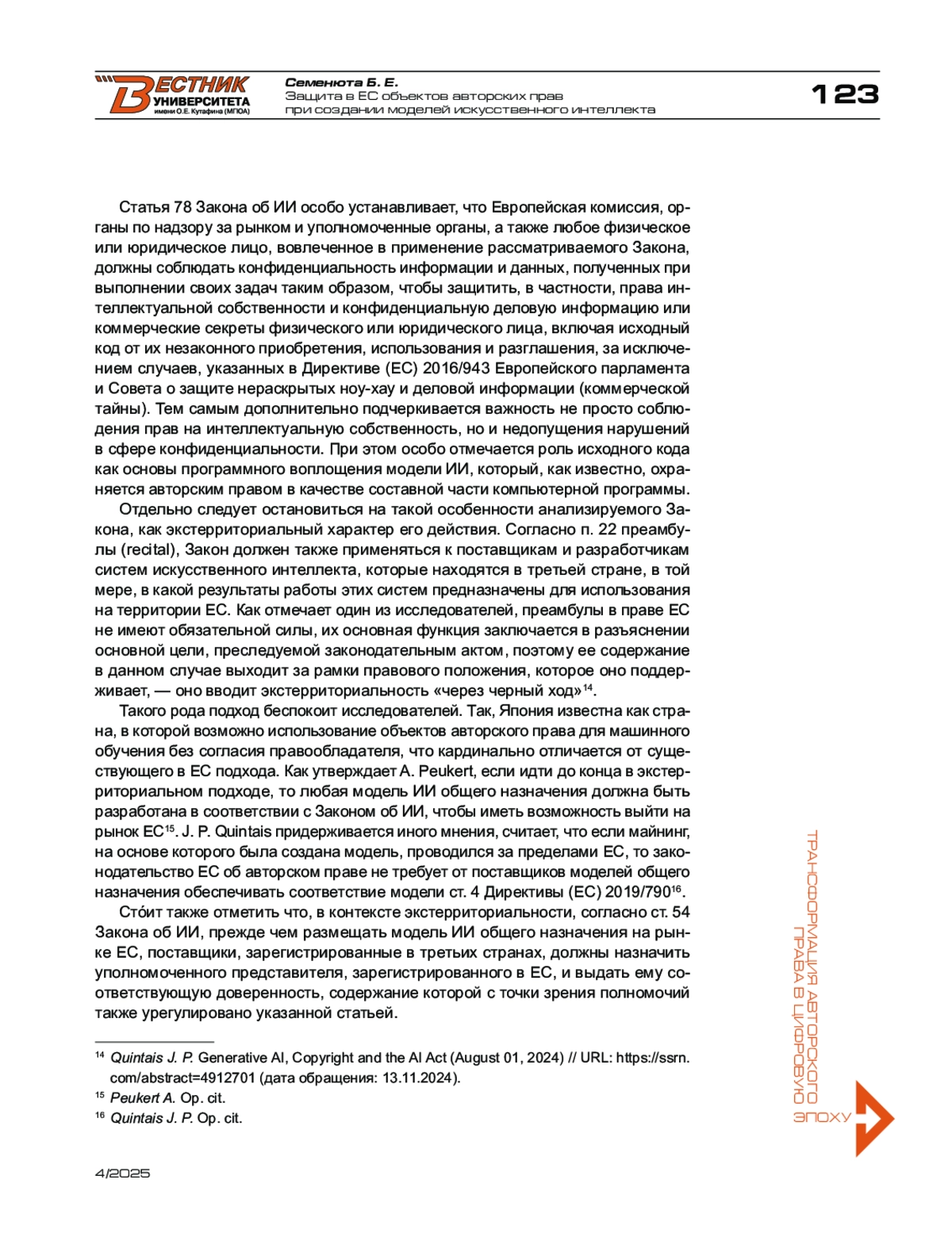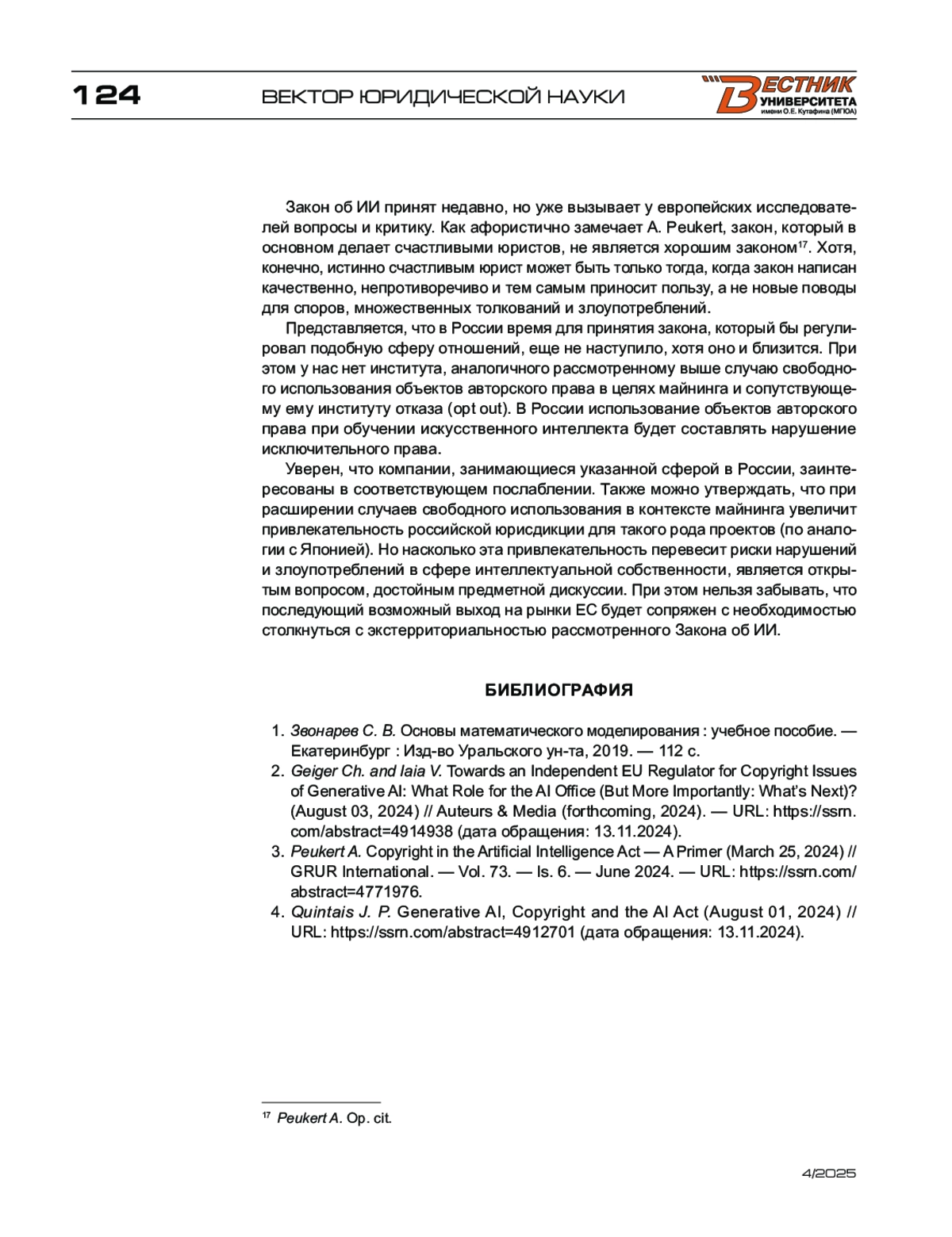 3. Peukert A. Copyright in the Artificial Intelligence Act - A Primer (March 25, 2024) // GRUR International. - Vol. 73. - Is. 6. - June 2024. - URL: https://ssrn.com/abstract=4771976.