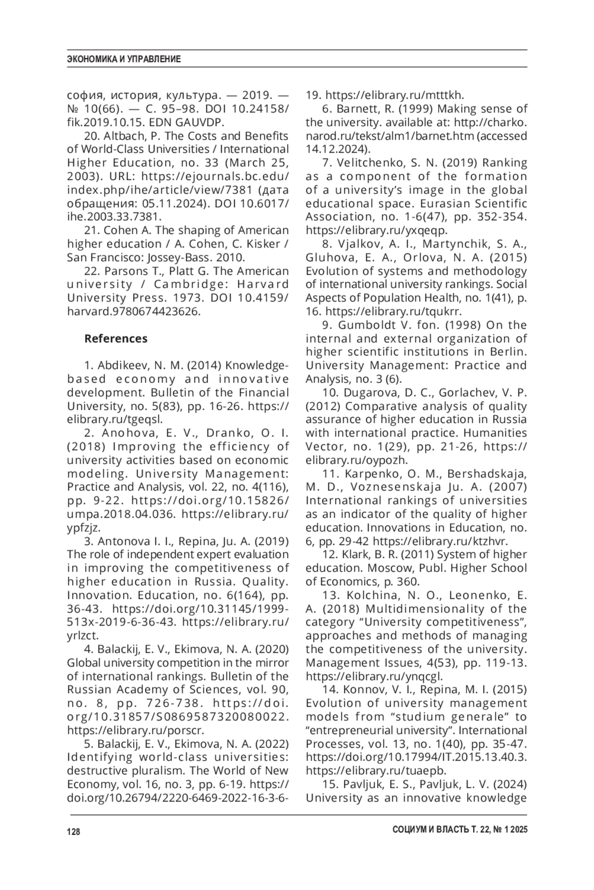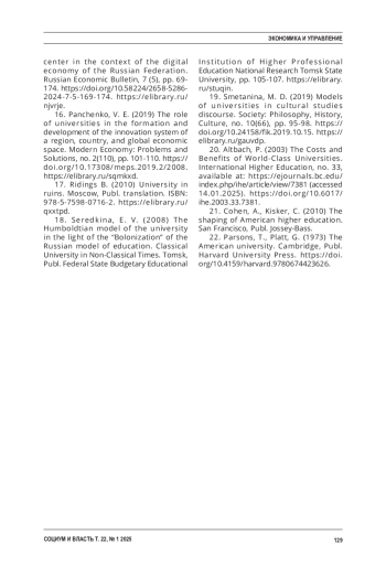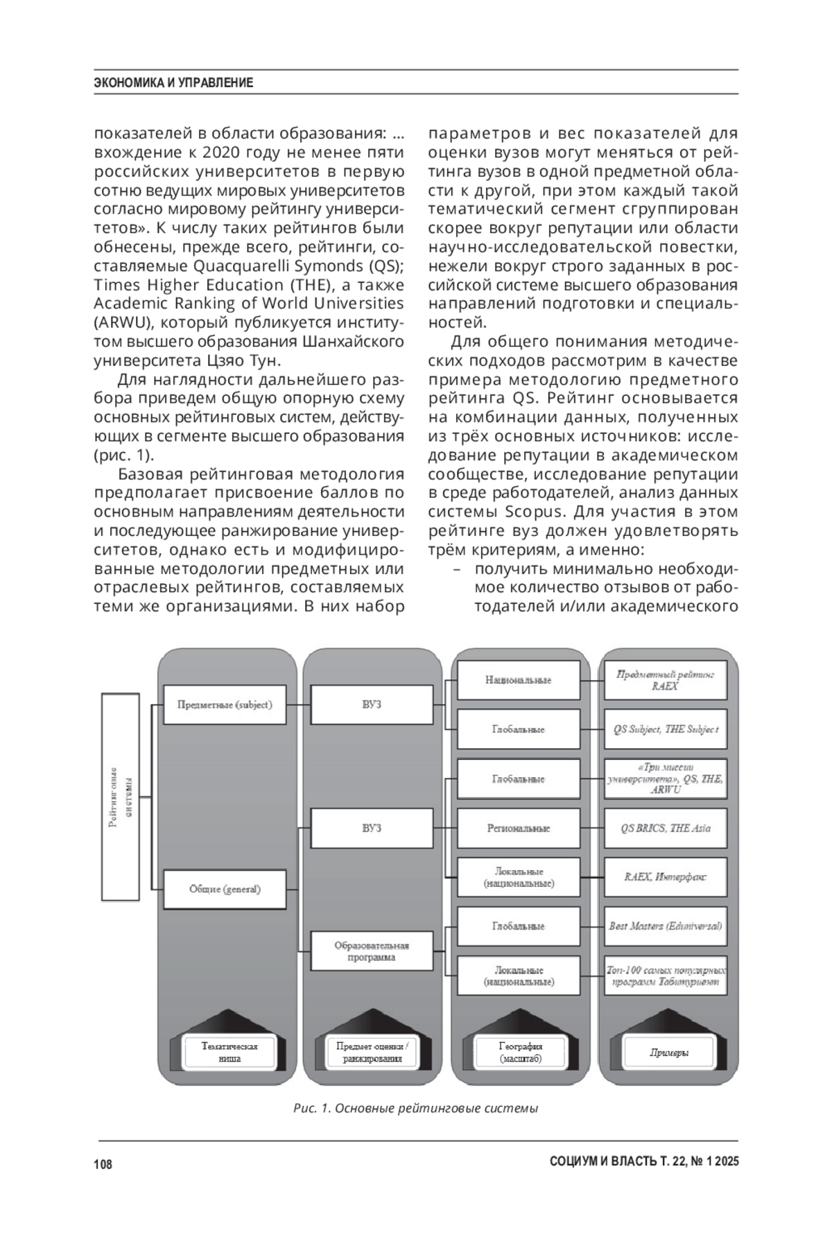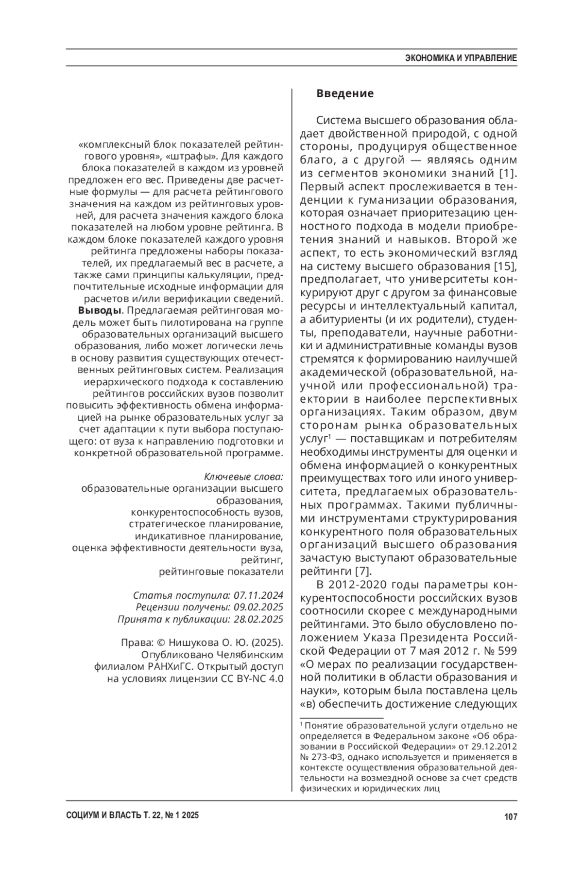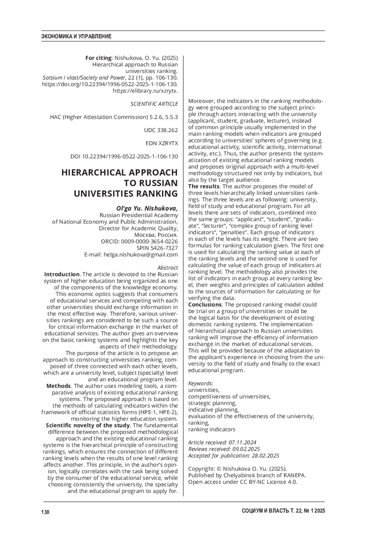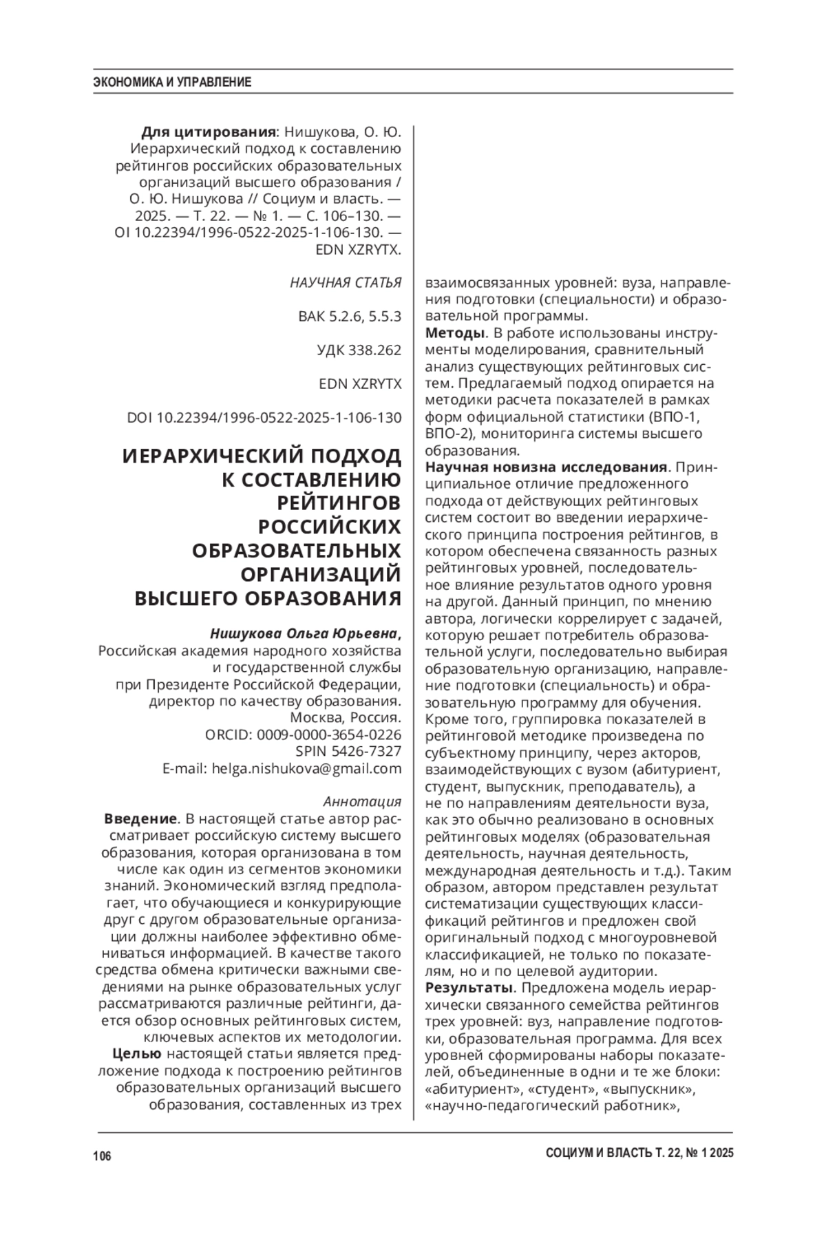 НИШУКОВА О. Ю. ИЕРАРХИЧЕСКИЙ ПОДХОД К СОСТАВЛЕНИЮ РЕЙТИНГОВ РОССИЙСКИХ ОБРАЗОВАТЕЛЬНЫХ ОРГАНИЗАЦИЙ ВЫСШЕГО ОБРАЗОВАНИЯ // СОЦИУМ И ВЛАСТЬ. 2025. Т. 22 № 1