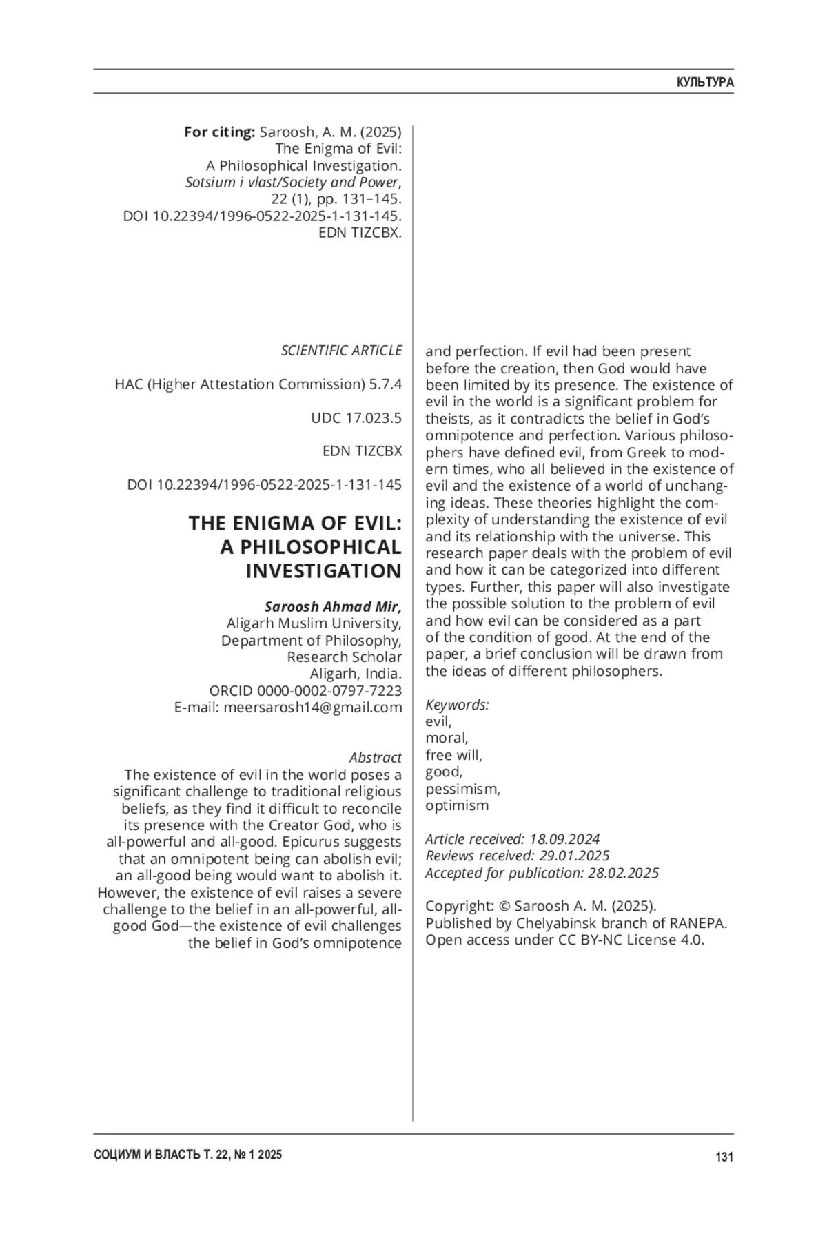 Существование зла в мире представляет собой серьезную проблему для традиционных религиозных верований, поскольку им трудно примирить его присутствие с Богом-создателем, всемогущим и всеблагостным. Эпикур предполагает, что всемогущее существо может уничтожить зло; всеблагое существо хотело бы его уничтожить. Однако существование зла ставит под сомнение веру во всемогущего и всеблагого Бога - существование зла ставит под сомнение веру во всемогущество и совершенство Бога Если бы зло существовало до сотворения мира, то Бог был бы ограничен его присутствием. Существование зла в мире - серьезная проблема для теистов, поскольку оно противоречит вере во всемогущество и совершенство Бога. Различные философы, начиная с греческих и заканчивая современными, давали определение злу, и все они верили в его существование и существование мира неизменных идей. Эти теории подчеркивают сложность понимания существования зла и его связи со Вселенной. Данная исследовательская работа посвящена проблеме зла и тому, как его можно классифицировать на различные виды. Кроме того, в работе рассматривается возможное решение проблемы зла и то, как зло можно рассматривать как часть добра. В конце работы будет сделан краткий вывод на основе идей различных философов.