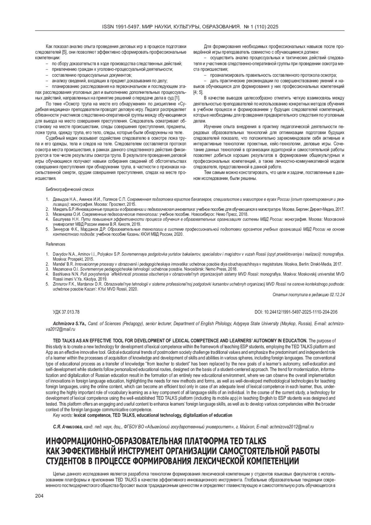 5. Зиннуров Ф.К., Марданов Д.Р Образовательные технологии в системе профессиональной подготовки курсантов учебных организаций МВД России на основе контекстного подхода: учебное пособие Казань: КЮИ МВД России, 2020. EDN: XWUPYO