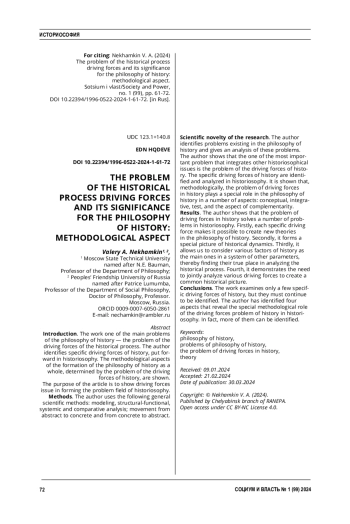 Методы. В исследовании использованы следующие общенаучные методы: моделирование, структурно-функциональный, системный и сравнительный анализ; движение от абстрактного к конкретному и от конкретного к абстрактному. Научная новизна исследования. Выявлены и проанализированы основные проблемы, существующие в философии истории. Автором показано, что одной из важнейших проблем, интегрирующей остальные историософские вопросы, выступает проблема движущих сил истории. Установлены конкретные движущие силы истории, анализируемые в историософии. Демонстрируется, что в методологическом плане проблема движущих сил в истории играет в философии истории особую роль в ряде аспектов: концептуальном, интегративном, тестовом, дополнительности.