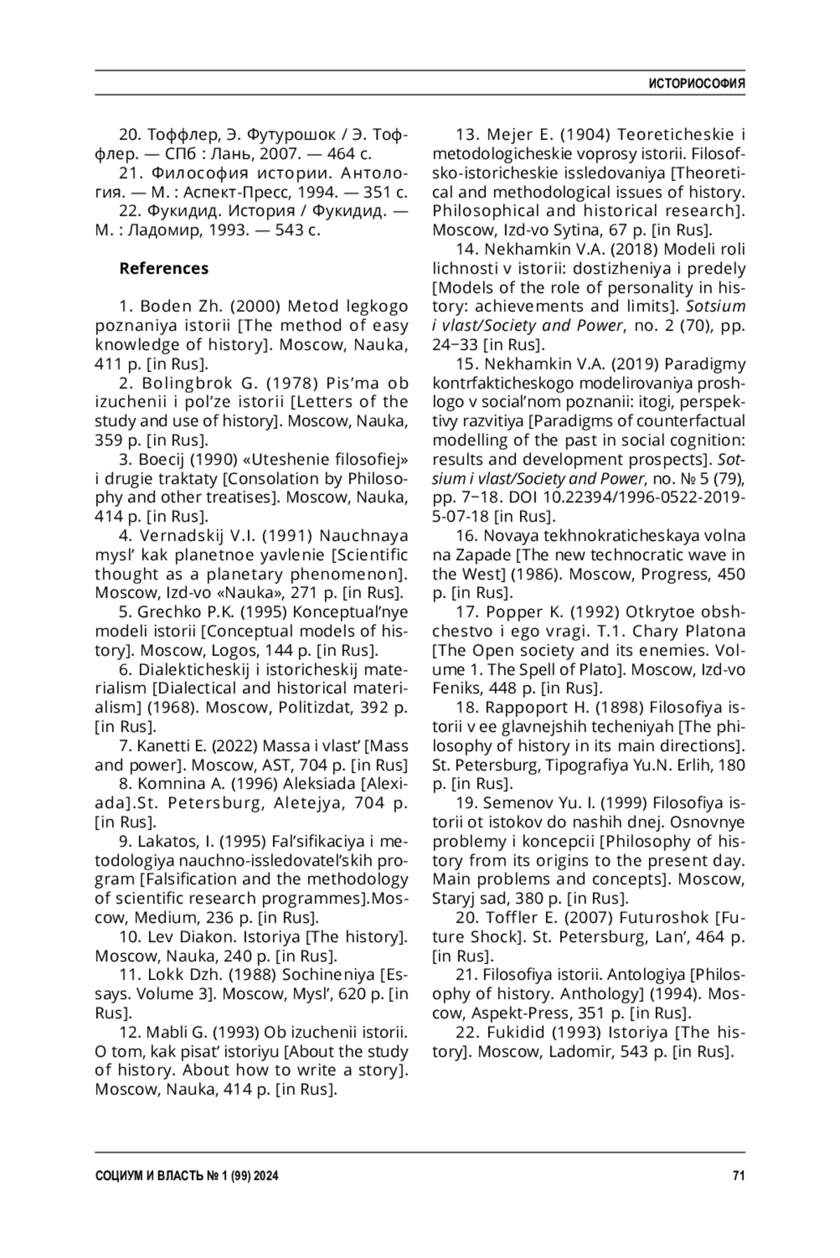 14. 	Нехамкин, В. А. Модели роли личности в истории: достижения и пределы / В. А. Нехамкин // Социум и власть. - 2018. - № 2 (70). - С. 24-33.  EDN: XRCGPR