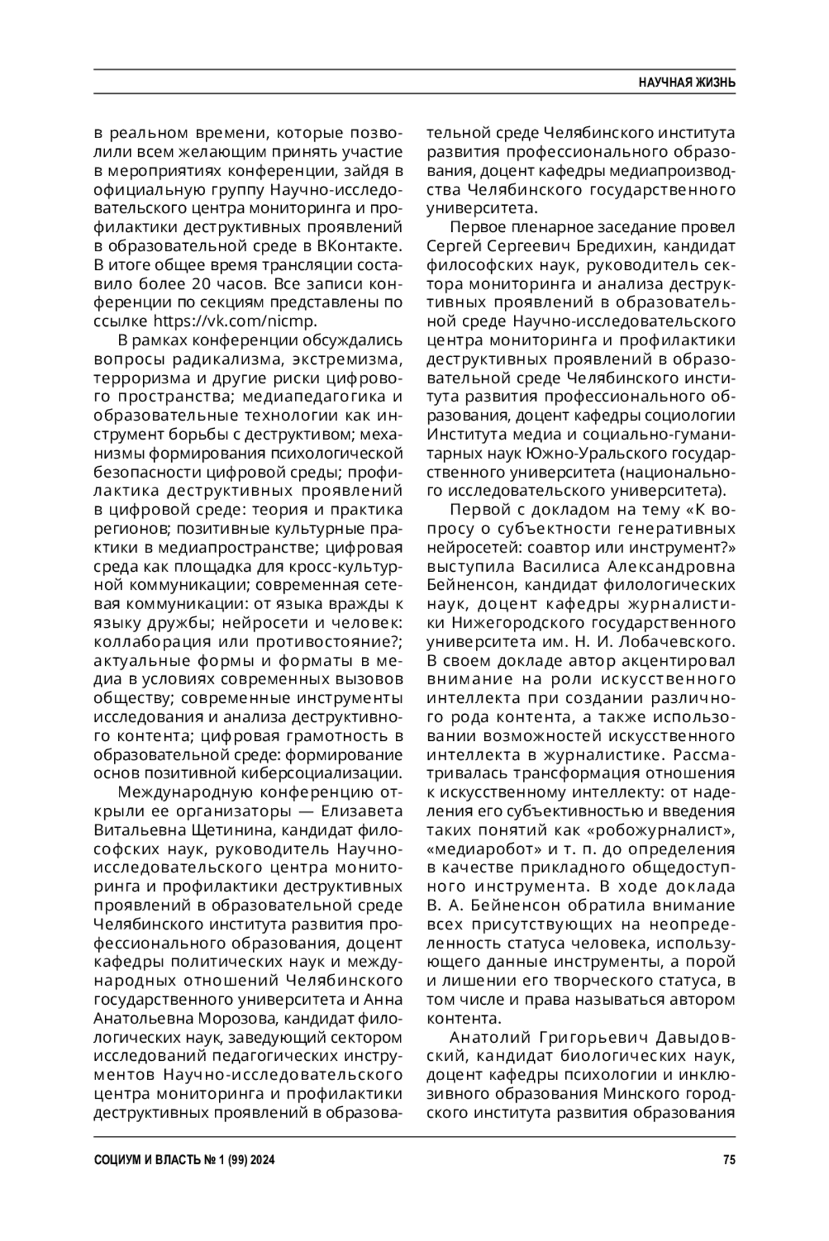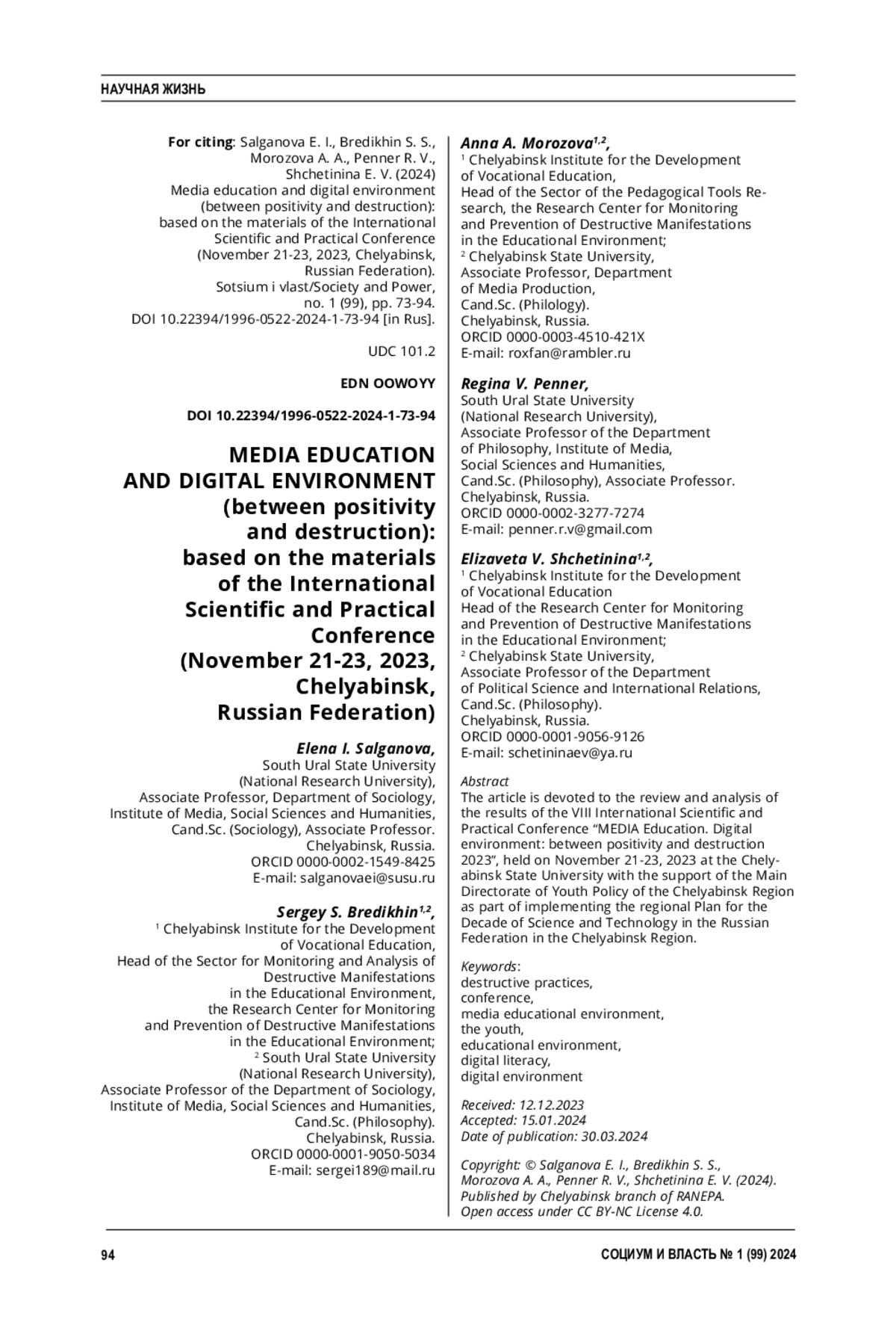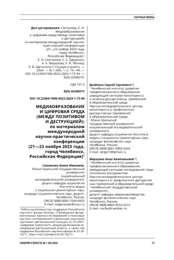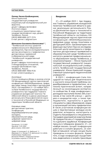 Статья посвящена обзору и анализу итогов VIII Международной научно-практической конференции «MEDIAОбразование. Цифровая среда: между позитивом и деструкцией 2023», состоявшейся 21-23 ноября 2023 г. на базе Челябинского государственного университета при поддержке Главного управления молодежной политики Челябинской области в рамках реализации регионального Плана Десятилетия науки и технологий в Российской Федерации на территории Челябинской области.