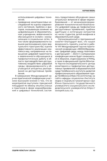 21—23 ноября 2023 г. при поддержке Главного управления молодежной политики Челябинской области в рамках реализации регионального Плана Десятилетия науки и технологий в Российской Федерации на территории Челябинской области состоялась VIII Международная научно-практическая конференция «MEDIAОбразование. Цифровая среда: между позитивом и деструкцией 2023». Организатором конференции выступил Научно-исследовательский центр мониторинга и профилактики деструктивных проявлений в образовательной среде Челябинского института развития профессионального образования города Челябинска, а соорганизаторами — Южно-Уральский государственный университет (национальный исследовательский университет), Челябинский государственный университет, Южно-Уральский государственный гуманитарно-педагогический университет.