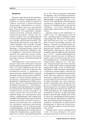 Процесс чувственного восприятия у каждого человека индивидуален. Восприятие и оценка красоты являются глубоко личными и субъективными процессами, зависящими от множества факторов, таких как культурный фон, личный опыт и психологические особенности. Но существуют направления в эстетике, которые связаны с попыткой выстроить логику или по - строить модель того, как формируются эстетические предпочтения индивидуума. Таковы «логическая эстетика», «алгоритмическая эстетика» и др. Для того, чтобы передать свои чувства, человек учится говорить, выражает эмоции, к примеру, с помощью языка танца, или иных форм творчества. Переход к эпохе цифровых технологий обогащает арсенал уже известных техник коммуникации новыми дополнительными языками: языками программирования [15, с. 312].