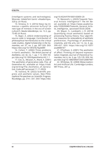 17. 	Cox, G. The aesthetics of generative code / G. Cox, A. McLean, A. Ward // Proc. of Generative Art. 2001. URL: https://slab.org/writing/The_Aesthetics_of_Generative_Code.pdf (дата обращения: 11.11.2023).