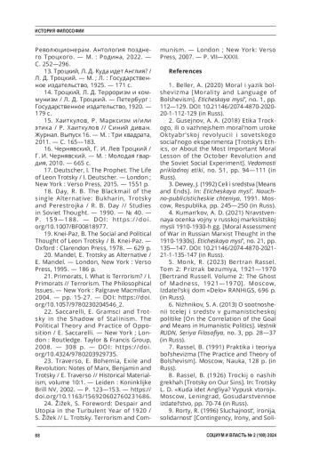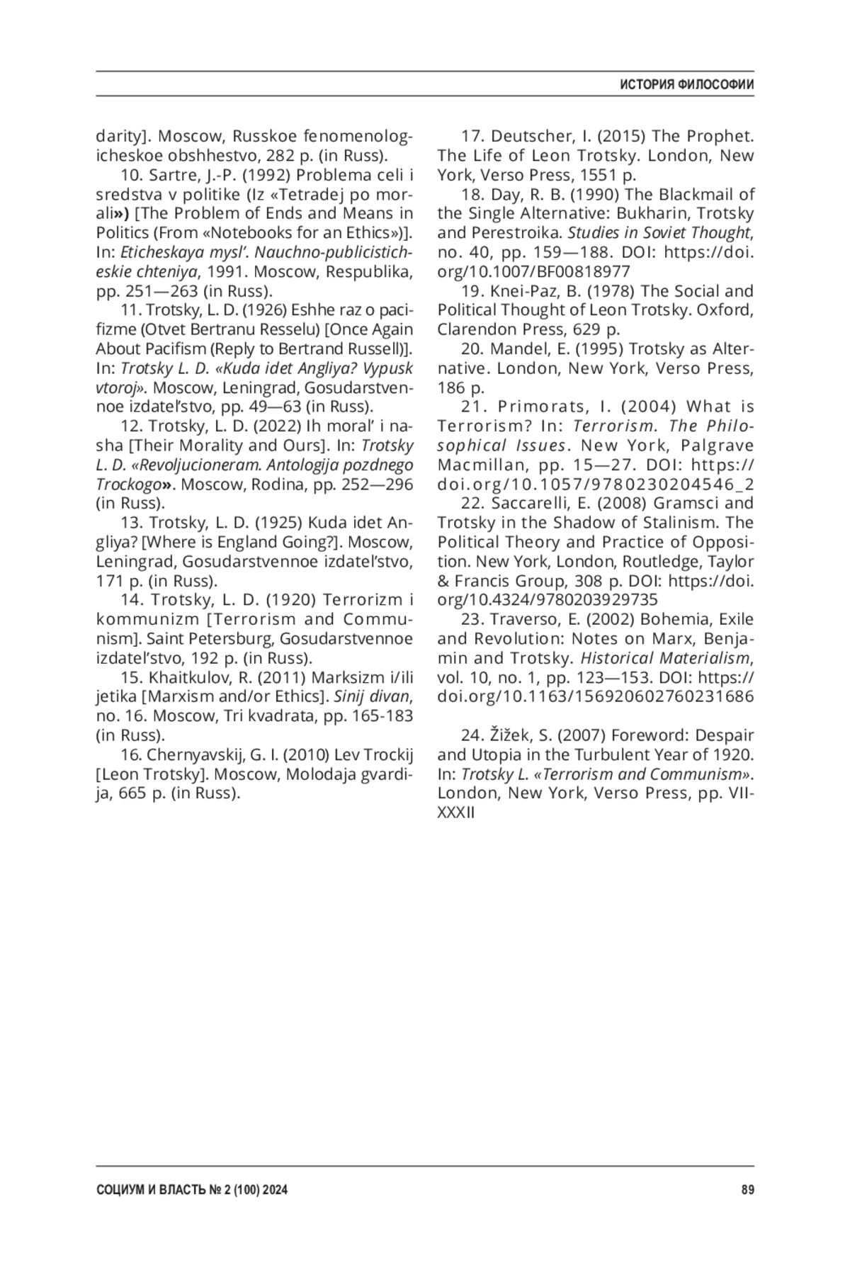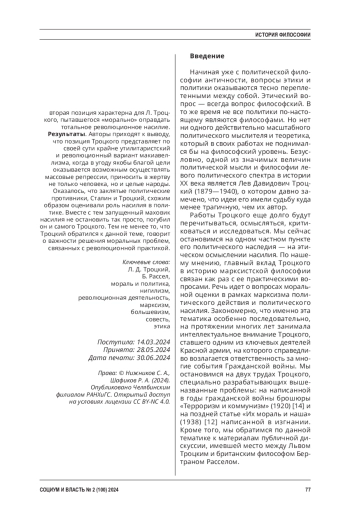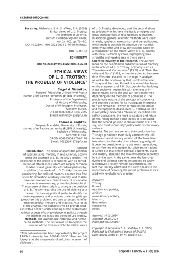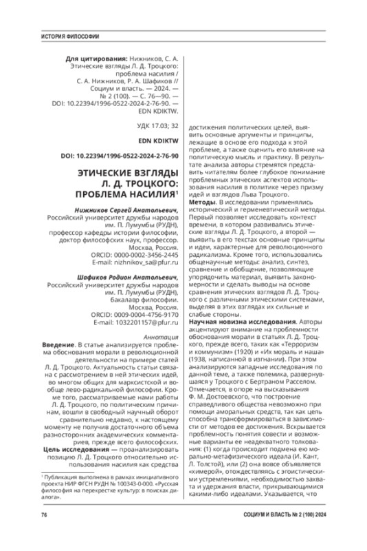 НИЖНИКОВ С. А., ШАФИКОВ Р. А. ЭТИЧЕСКИЕ ВЗГЛЯДЫ Л. Д. ТРОЦКОГО: ПРОБЛЕМА НАСИЛИЯ // СОЦИУМ И ВЛАСТЬ. 2024. № 2 (100)