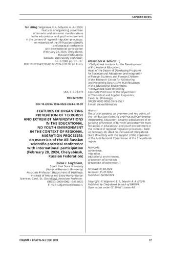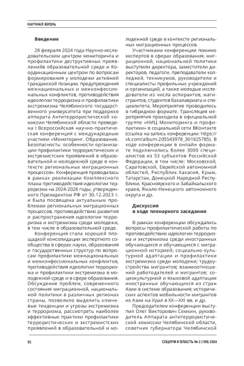 28 февраля 2024 года Научно-исследовательским центром мониторинга и профилактики деструктивных прояв - ленийв образовательной среде и Ко - ординационным центром по вопросам формирования у молодежи активной гражданской позиции, предупреждения межнациональных и межконфессиональных конфликтов, противодействия идеологии терроризма и профилактики экстремизма Челябинского государственного университета при поддержке аппарата Антитеррористической комиссии Челябинской области проведена I Всероссийская научно-практическая конференция с международным участием «Мониторинг. Образование. Безопасность: особенности организации профилактики террористических и экстремистских проявлений в образовательной и молодежной среде в кон - тексте региональных миграционных процессов». Конференция проводилась в рамках реализации Комплексного плана противодействия идеологии терроризма на 2024-2028 годы, утвержденного Президентом РФ от 30.12.2023 г. и была посвящена актуальным проблемам региональных миграционных процессов, противодействию развития и распространения идеологии терроризма и экстремизма среди молодежи, в том числе в образовательной среде