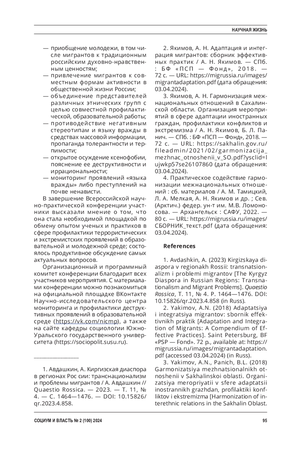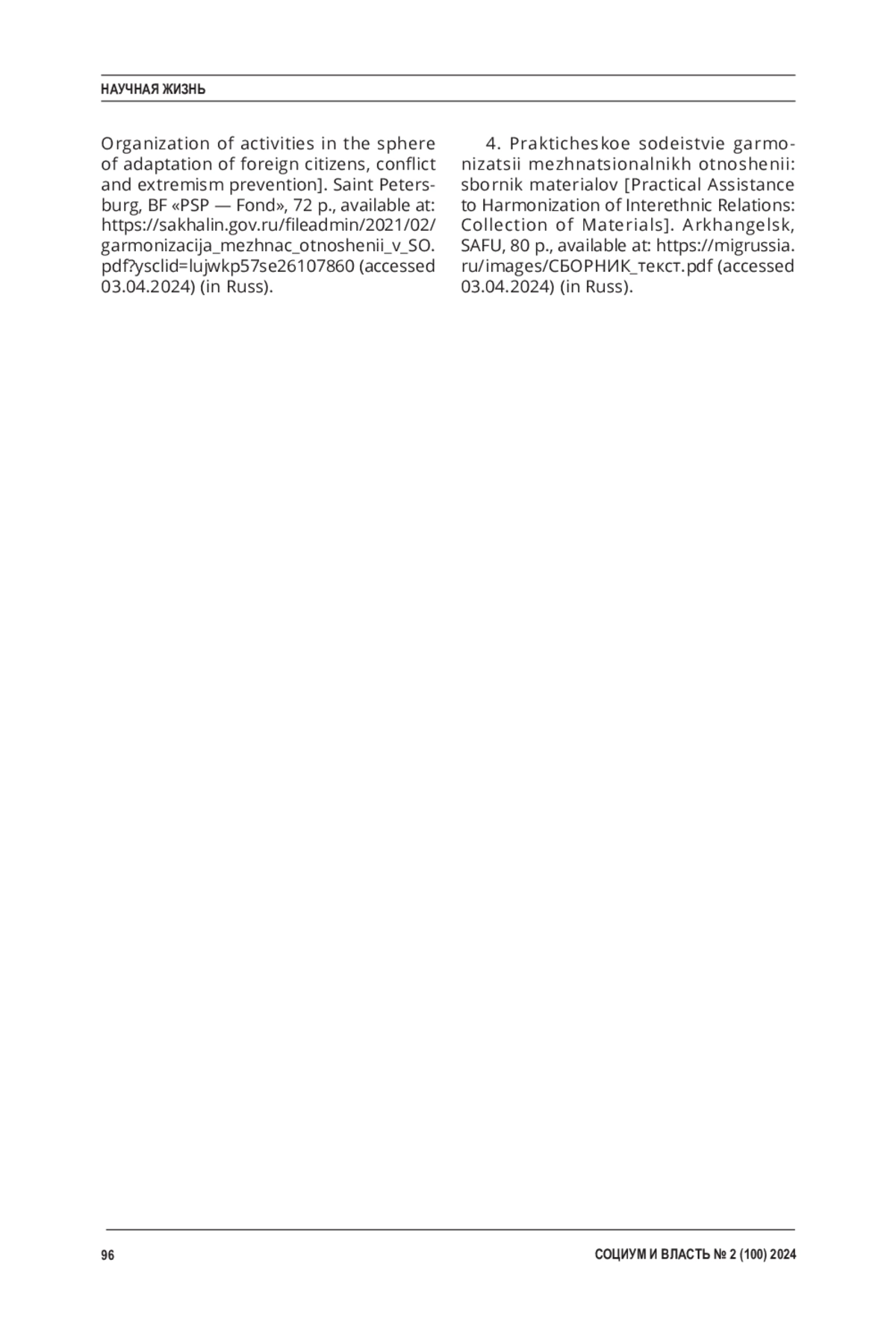 4. 	Практическое содействие гармонизации межнациональных отношений: сб. материалов / А. М. Тамицкий, Л. А. Мелкая, А. Н. Якимов и др.; Сев. (Арктич.) федер. ун-т им. М.В. Ломоносова. - Архангельск: САФУ, 2022. - 80 с. - URL: https://migrussia.ru/images/СБОРНИК_текст.pdf (дата обращения: 03.04.2024). EDN: ETCNVR
