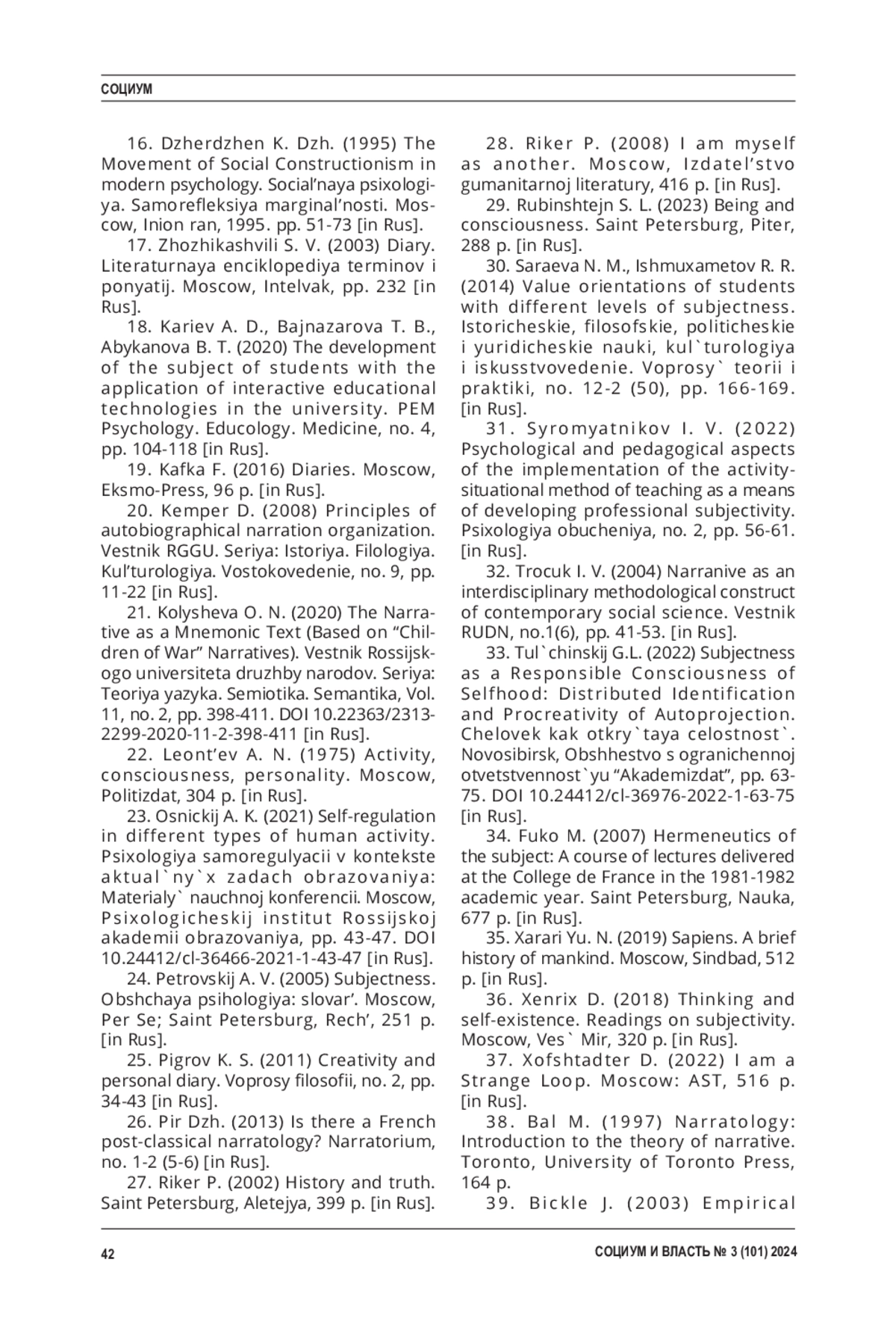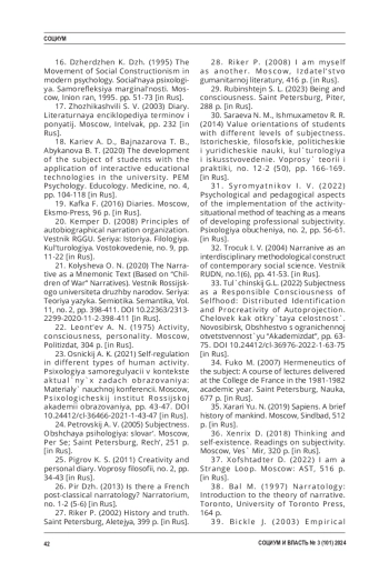Выводы. Нарративные практики оказывают положительное влияние на развитие субъектности, поскольку формируют осознанное и деятельностное отношение человека к миру и самому себе. В качестве нарративных практик могут выступать дневниковые записи, автобиографии, повествования с элементами исповеди, метод деконструкции доминирующих дискурсов. Они позволяют организовать жизненный опыт, определить систему ценностей, ставить цели, подбирать способы их осуществления, чувствовать себя автором собственной жизни.