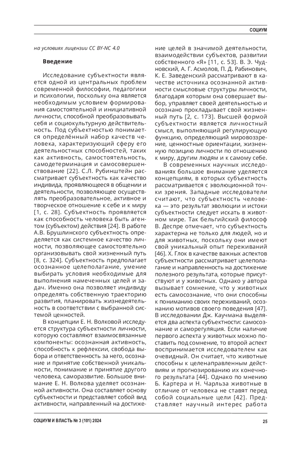 Исследование субъектности является одной из центральных проблем современной философии, педагогики и психологии, поскольку она является необходимым условием формирования самостоятельной и инициативной личности, способной преобразовывать себя и социокультурную действительность. Под субъектностью понимается определённый набор качеств человека, характеризующий сферу его деятельностных способностей, таких как активность, самостоятельность, самодетерминация и самосовершен - ствование [22]. С. Л. Рубинштейн рассматривает субъектность как качество индивида, проявляющееся в общении и деятельности, позволяющее осуществлять преобразовательное, активное и творческое отношение к себе и к миру [1, с. 28]. Субъектность проявляется как способность человека быть агентом (субъектом) действия [24]. В работе А. В. Брушлинского субъектность определяется как системное качество лич - ности, позволяющее самостоятельно организовывать свой жизненный путь [8, с. 324]. Субъектность предполагает осознанное целеполагание, умение выбирать условия необходимые для выполнения намеченных целей и задач. Именно она позволяет индивиду определять собственную траекторию развития, планировать жизнедеятельность в соответствии с выбранной системой ценностей.