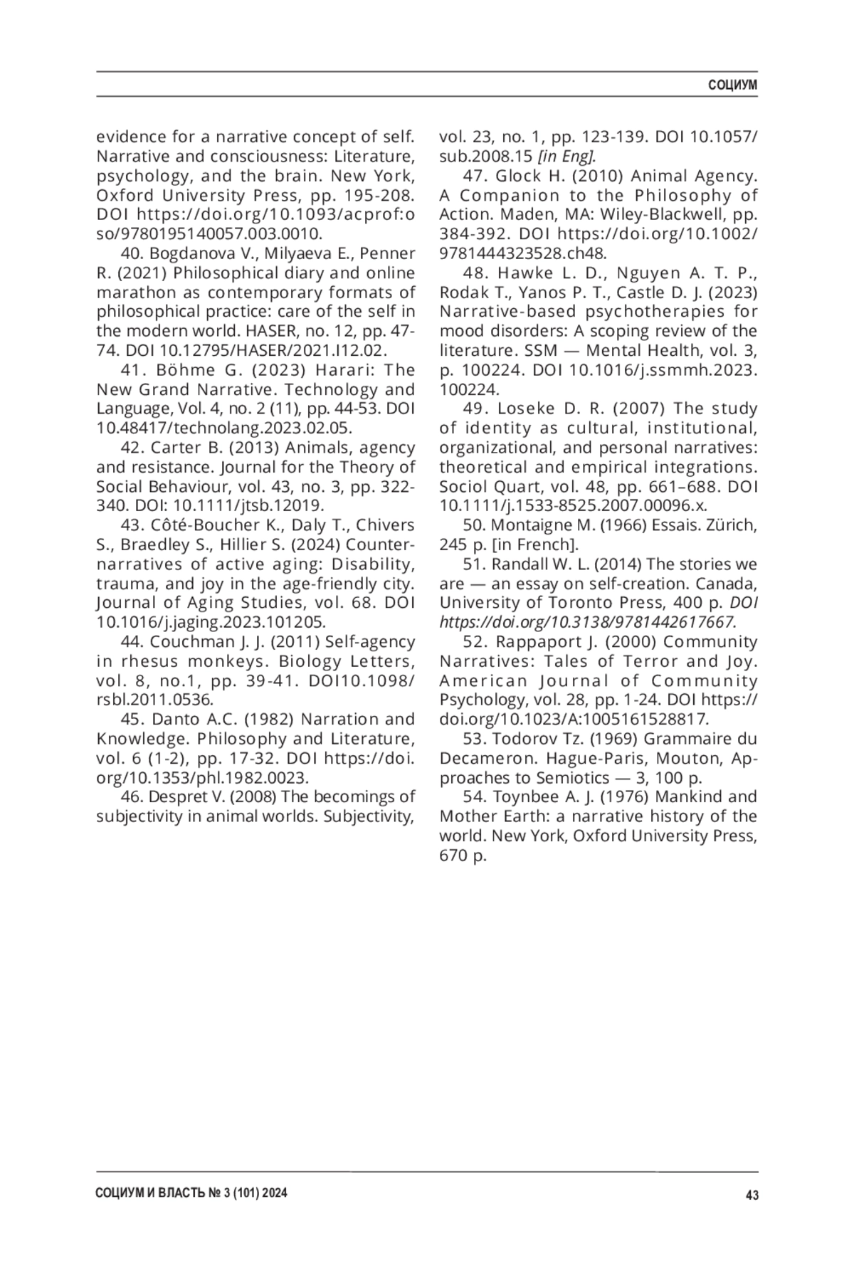 46. 	Despret, V. The Becomings of Subjectivity in Animal Worlds / V. Despret // Subjectivity. - 2008. - Vol. 23, No. 1. - P. 123-139.  DOI: 10.1057/sub.2008.15  EDN: NLHRAR
