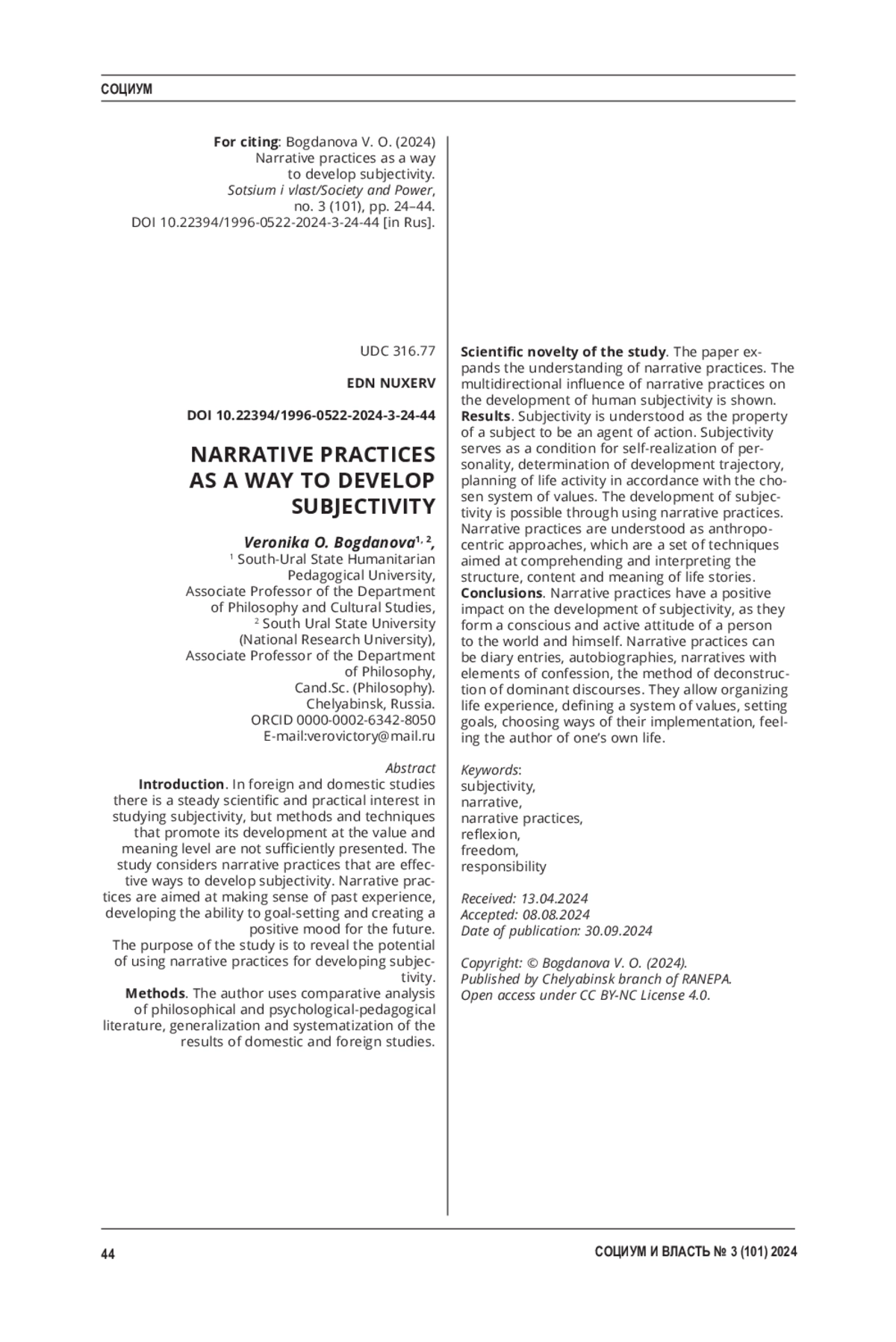 Методы. В исследовании применяется сравнительный анализ философской и психолого-педагогической литературы, обобщение и систематизация результатов отечественных и зарубежных исследований. Новизна исследования. В работе расширено представление о нарративных практиках. Показано разнонаправленное влияние нарративных практик на развитие субъектности человека.