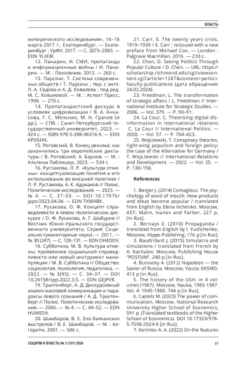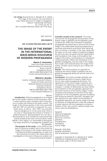 Выводы. В статье рассмотрены глобалистский и антиглобалисткий направления формирования образа врага в масс-медийном пропагандистском дискурсе. Выявлена значимость образа врага в политической коммуникации для приверженцев любых политических взглядов. Фиксируется ряд отличий. В рамках антиглобалисткого подхода дискурсивный конструкт образа врага институционализируется и транслируется на уровне государства. Сторонники антиглобалисткого подхода транслируют свой дискурс опираясь на доктрины, стратегии и законы, зафиксированные государством. В рамках глобалистского подхода образ врага формируется на базе придания субъектности под влиянием общественного мнения с последующей институционализацией «новой нормальности» преимущественно через массовую культуру и гражданское неповиновение.