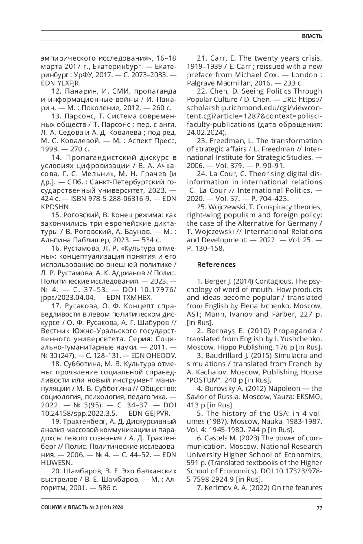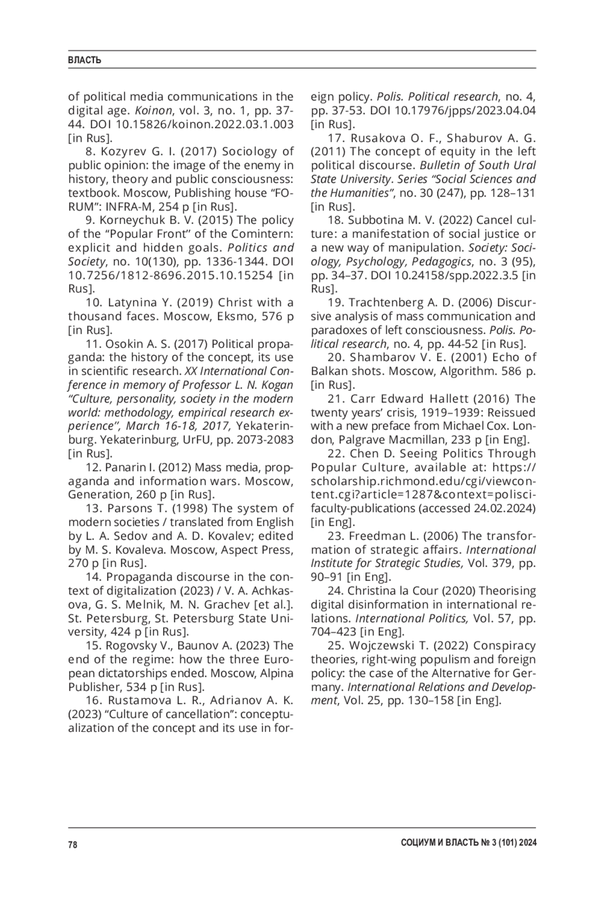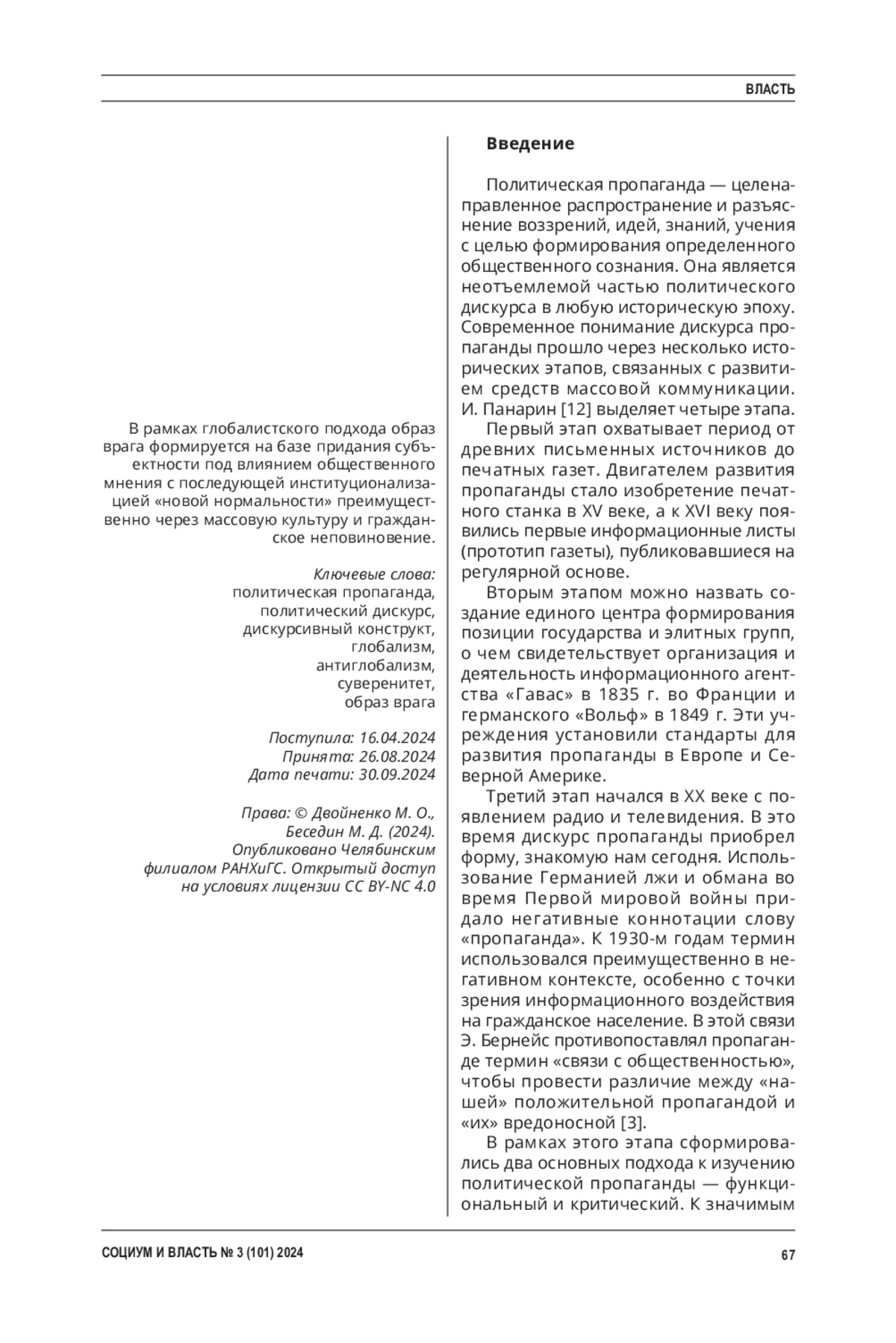 Введение. Политическая пропаганда является неотъемлемой частью современной сферы коммуникации, в рамках которой политические акторы транслируют свою интерпретацию реальности и влияют на общественные массы. Образ врага наиболее доступно объясняет, кто такие «МЫ» и что важно для конкретного актора, а также кто такие «ОНИ» и чем они опасны. При этом в политическом дискурсе нет единства в интерпретации понятия «враг». Представления о нем могут быть институализированы или же существовать вне институционального поля и транслироваться средствами массовой коммуникации (СМК). В этой связи целесообразно выделить два больших направления пропаганды: глобалистский и антиглобалисткий.