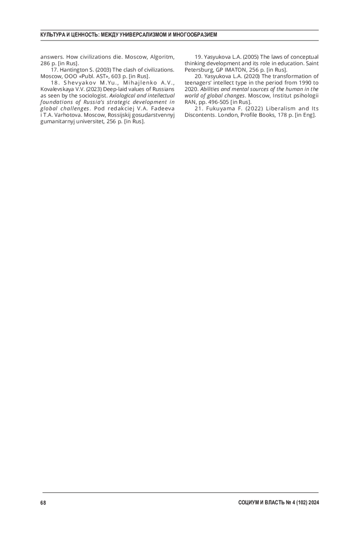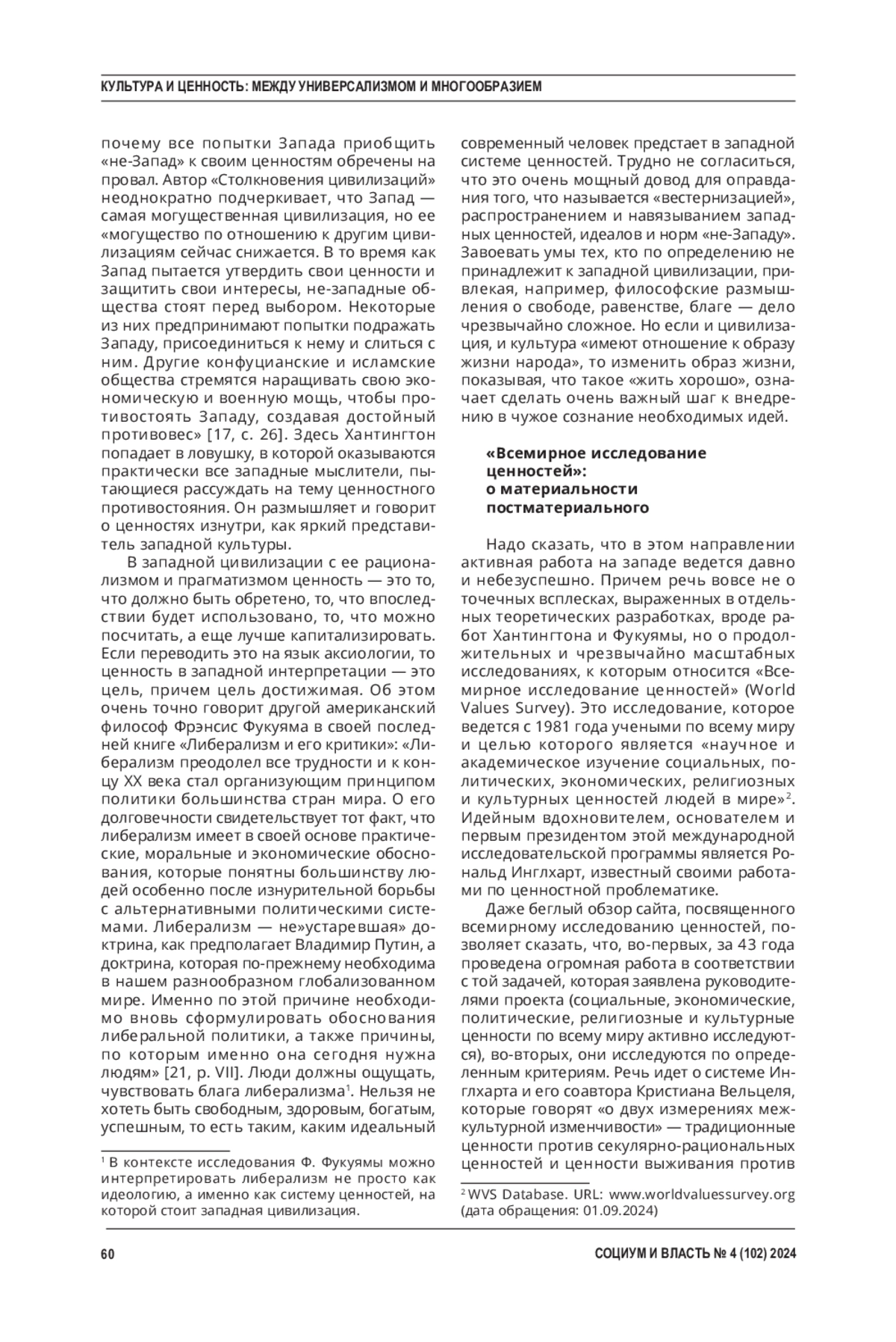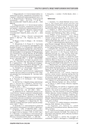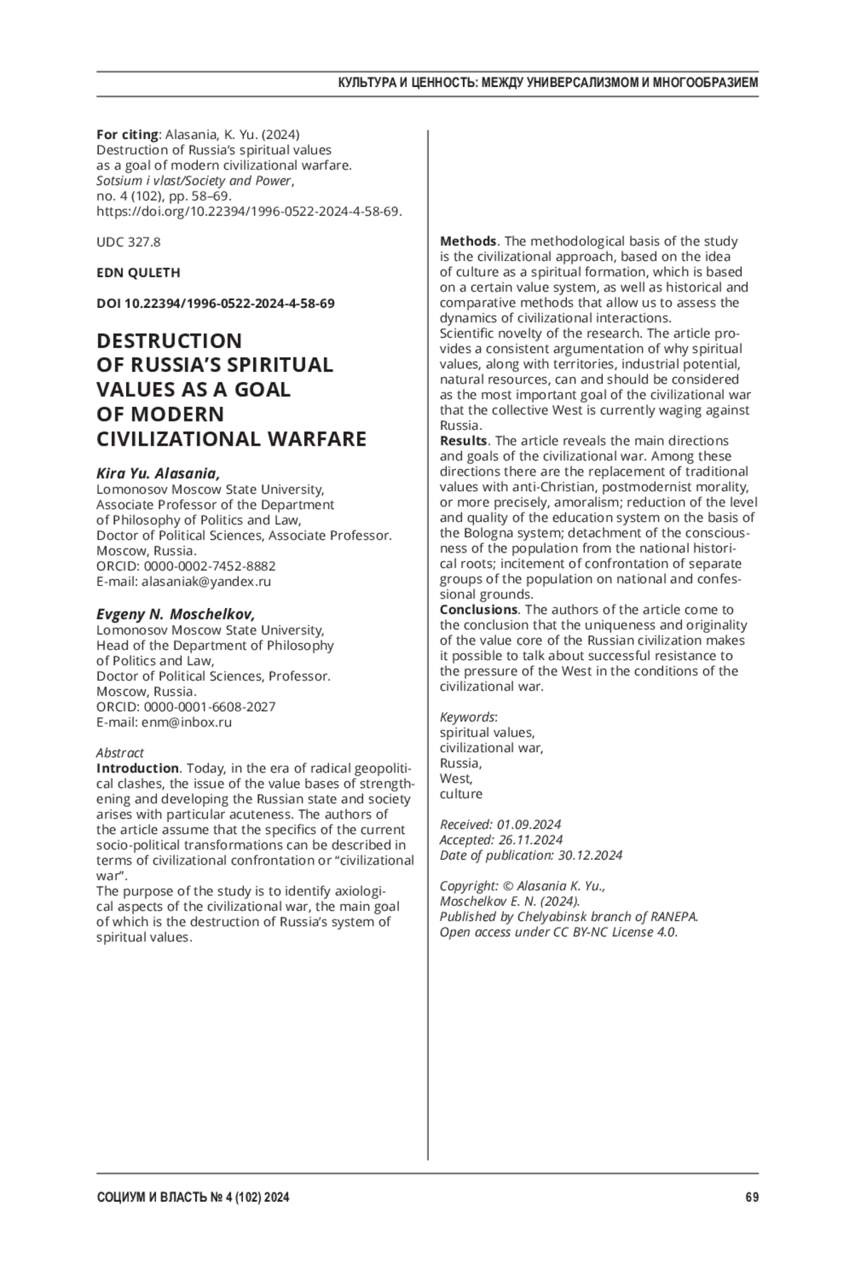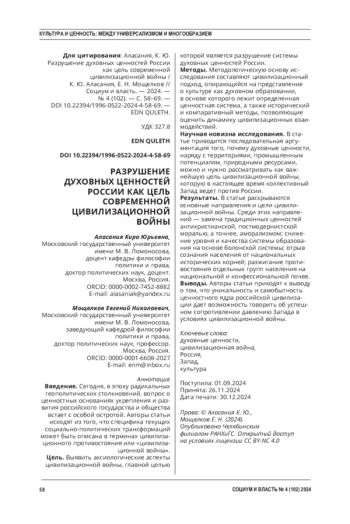 АЛАСАНИЯ К. Ю., МОЩЕЛКОВ Е. Н. РАЗРУШЕНИЕ ДУХОВНЫХ ЦЕННОСТЕЙ РОССИИ КАК ЦЕЛЬ СОВРЕМЕННОЙ ЦИВИЛИЗАЦИОННОЙ ВОЙНЫ // СОЦИУМ И ВЛАСТЬ. 2024. № 4 (102)
