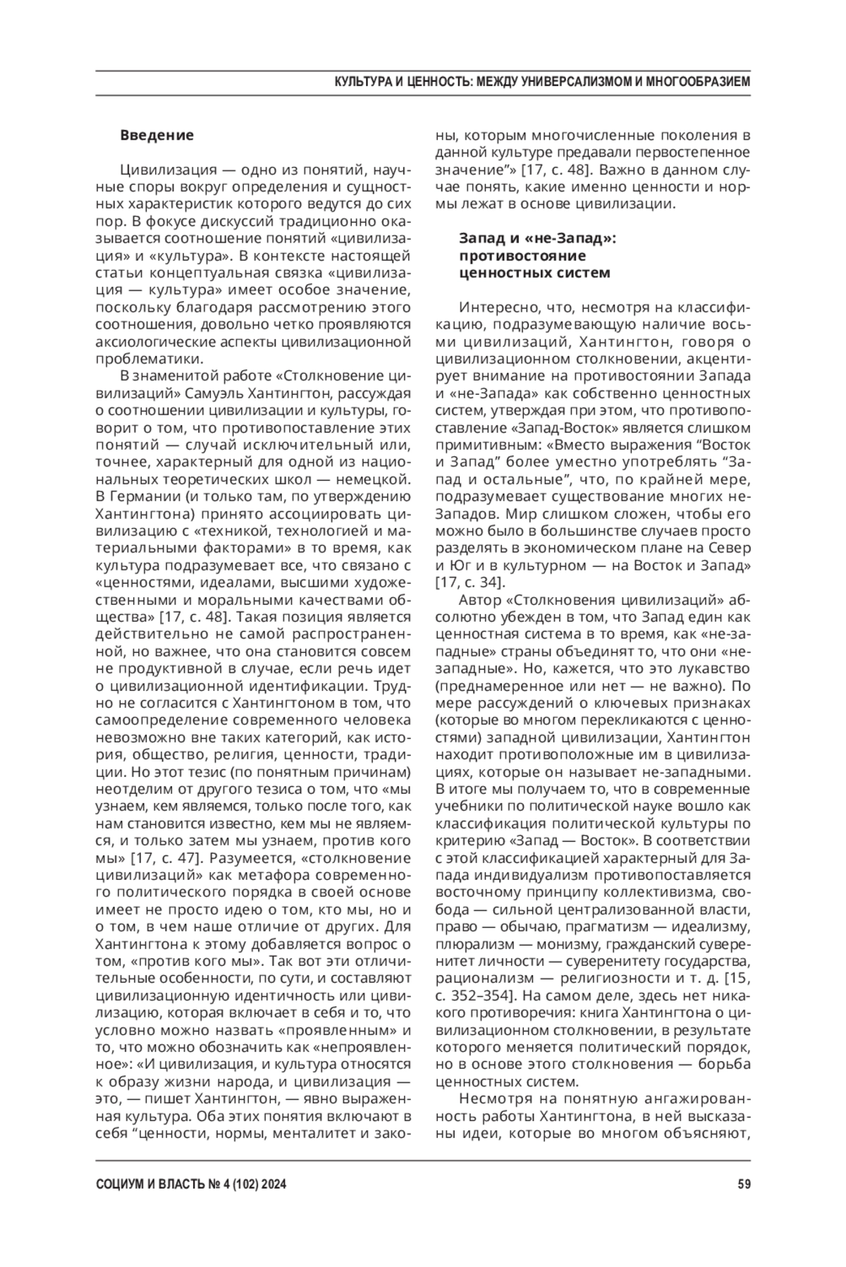 Введение. Сегодня, в эпоху радикальных геополитических столкновений, вопрос о ценностных основаниях укрепления и развития российского государства и общества встает с особой остротой. Авторы статьи исходят из того, что специфика текущих социально-политических трансформаций может быть описана в терминах цивилизационного противостояния или «цивилизационной войны».