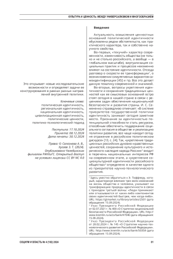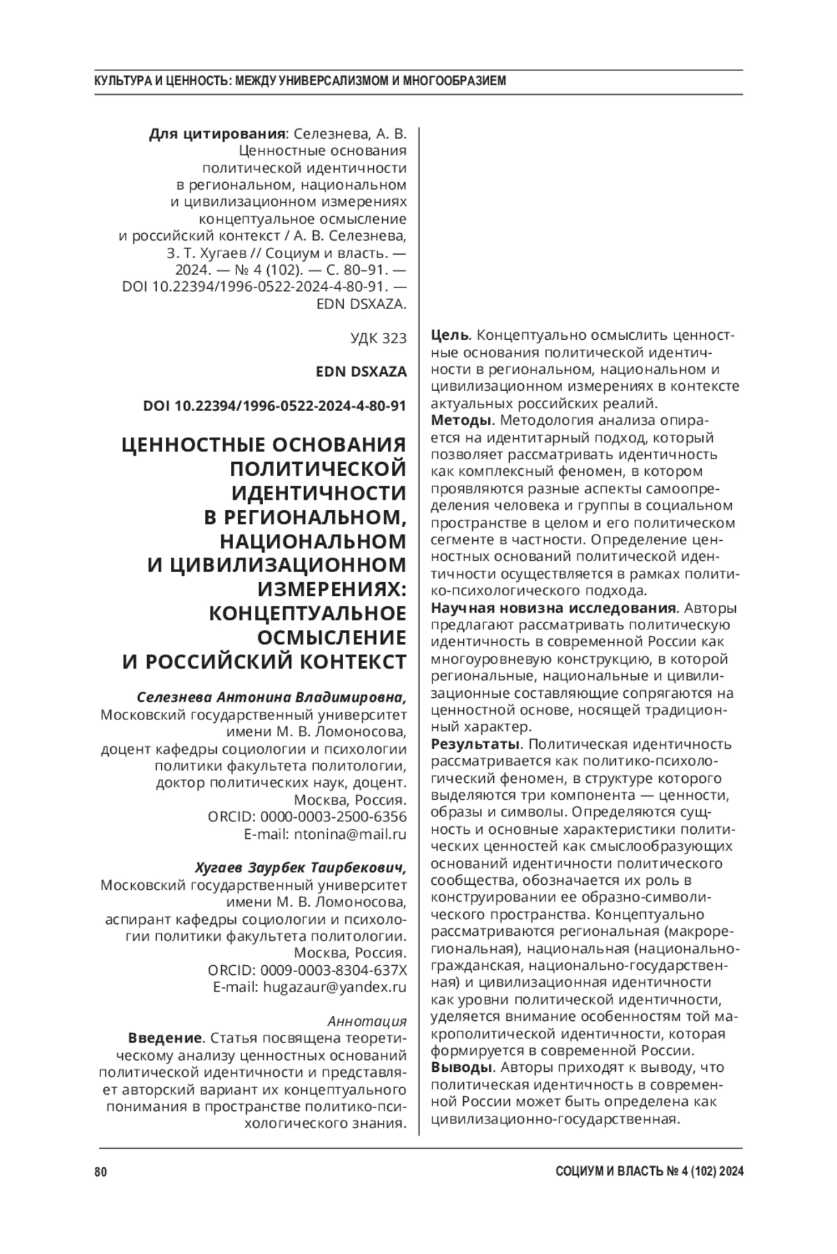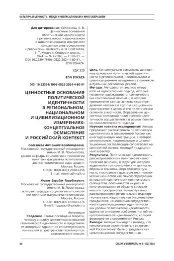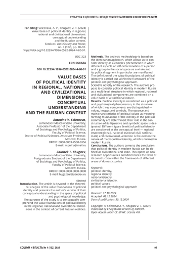 Цель. Концептуально осмыслить ценностные основания политической идентичности в региональном, национальном и цивилизационном измерениях в контексте актуальных российских реалий.