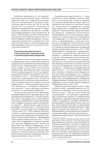 Методы. Методология анализа опирается на идентитарный подход, который позволяет рассматривать идентичность как комплексный феномен, в котором проявляются разные аспекты самоопределения человека и группы в социальном пространстве в целом и его политическом сегменте в частности. Определение ценностных оснований политической идентичности осуществляется в рамках политико- психологического подхода. Научная новизна исследования. Авторы предлагают рассматривать политическую идентичность в современной России как многоуровневую конструкцию, в которой региональные, национальные и цивилизационные составляющие сопрягаются на ценностной основе, носящей традиционный характер.