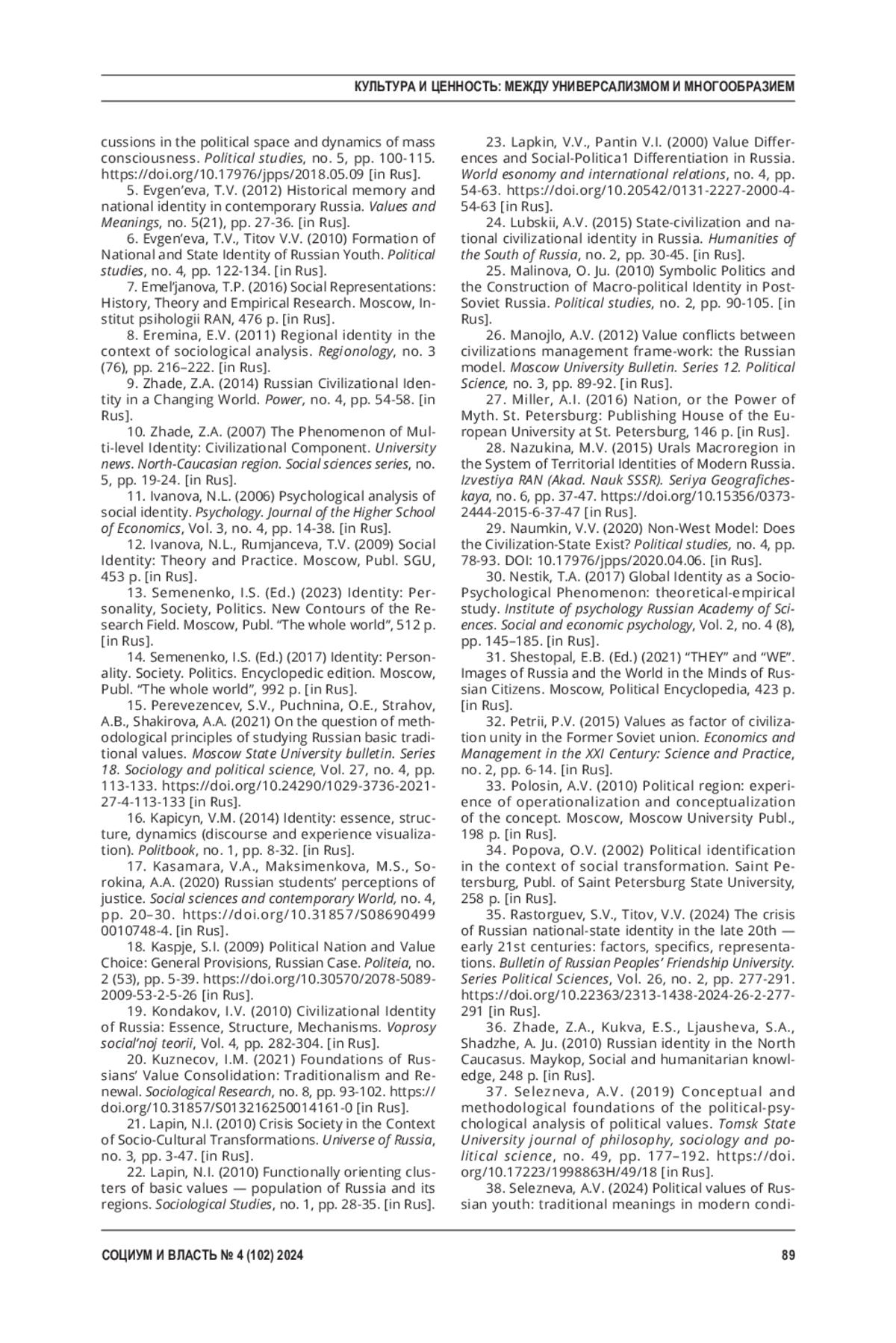 4. 	Дробижева, Л. М. Российская идентичность: дискуссии в политическом пространстве и динамика массового сознания / Л. М. Дробижева // Полис. Политические исследования. - 2018. - № 5. - С. 100-115.  DOI: 10.17976/jpps/2018.05.09  EDN: YAEHZR