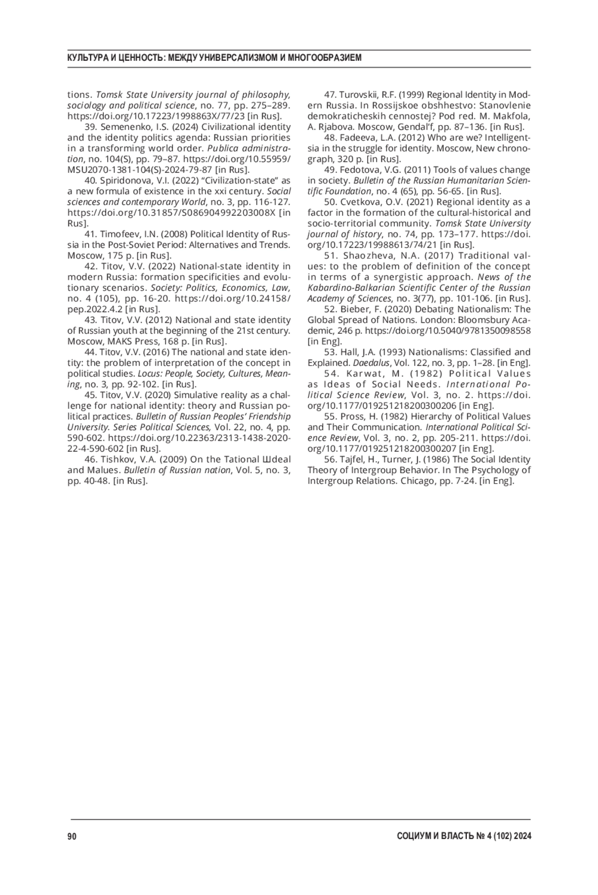 46. 	Тишков, В. А. О национальном идеале и ценностях / В. А. Тишков // Вестник Российской нации. - 2009. - № 3 (5). - С. 40-48.  EDN: KOHPVR