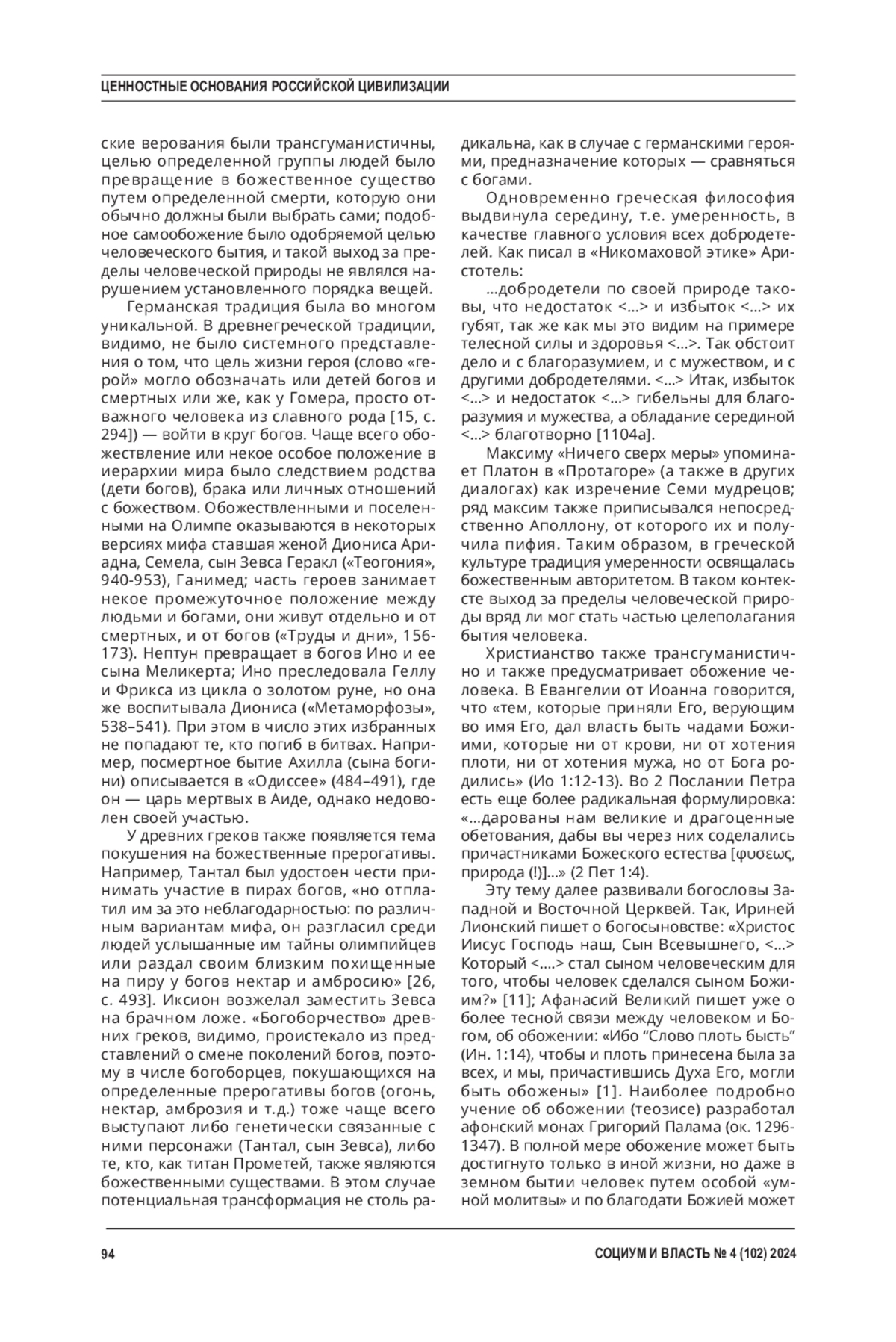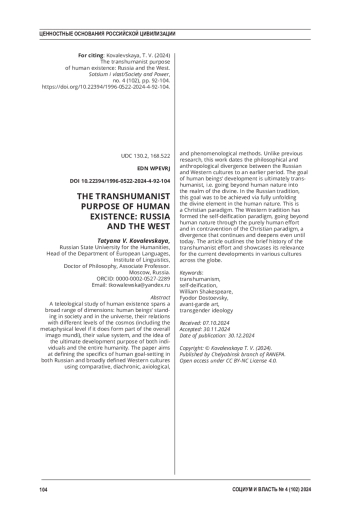 Философско-антропологическое исследование человека с точки зрения цели его существования охватывает широкий спектр измерений человеческой жизни: осмысление положения человека в социуме и в универсуме, его взаимоотношения с различными уровнями бытия (включая метафизический, если таковой составляет часть картины мира), систему его ценностей и представление о конечной цели развития как отдельной личности, так и всего человечества. Цель данной работы состоит в том, чтобы определить специфику целеполагания человека в русской и в широко понимаемой западной культурах с применением компаративного, диахронного, аксиологического и феноменологического методов. В отличие от предшествующих исследований, момент расхождения философской антропологии в русской и западной культурах в данной работе датируется не Новым временем, а Средними веками. Цель бытия человека в пределе трансгуманистична, это выход за пределы человеческого в направлении божественного. В русской традиции эта цель достигалась полноценным развертыванием человеческой природы как несущей в себе божественное начало, это принципиально христианская парадигма. В западной (и особенно ярко в германской) традиции складывается парадигма самообожения, выхода за пределы человечности усилиями самого человека и вопреки христианским установкам. Это расхождение наблюдается и сегодня; в статье очерчивается его краткая история и показывается релевантность этой проблемы для происходящих сейчас практически во всех в западных обществах процессов.