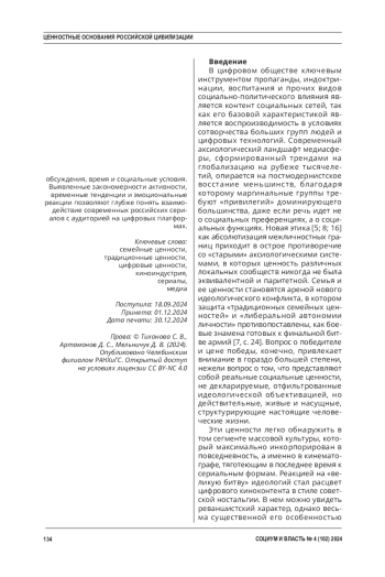 Введение. Статья посвящена анализу семейных ценностей в институциональном и пользовательском контенте, сопровождающем цифровые сериалы, которые отражают ностальгическое отношение к советской эпохе.