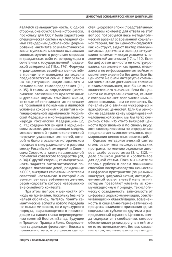 Результаты. Авторы рассматривают семейные ценности в рамках коммуникативного подхода, относя их к ценностям цифровой эпохи, под которым понимается элементы смыслового содержания сообщения, при этом семейные ценности они трактуют в зависимости от ракурса анализа как социальный конструкт, интерсубъективный смысл и инструмент социального признания.