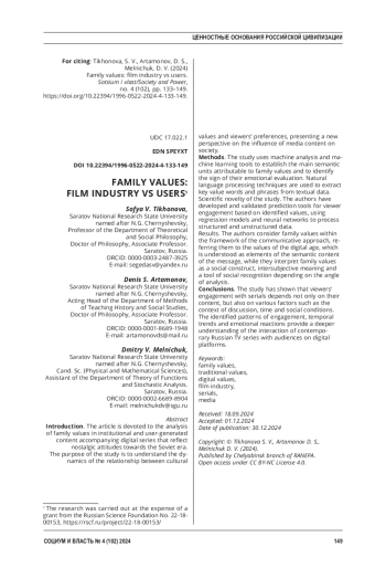 Методы. В исследовании использованы инструменты машинного анализа и машинного обучения, позволяющие установить основные семантические единицы, относимые к семейным ценностям, и выявить знак их эмоциональной оценки. Применяются техники обработки естественного языка для выделения ключевых ценностных слов и фраз из текстовых данных. Научная новизна исследования. Разработаны и апробированы инструменты предсказания вовлеченности зрителей, основанные на выявленных ценностях, использующие регрессионные модели и нейронные сети для обработки структурированных и неструктурированных данных.