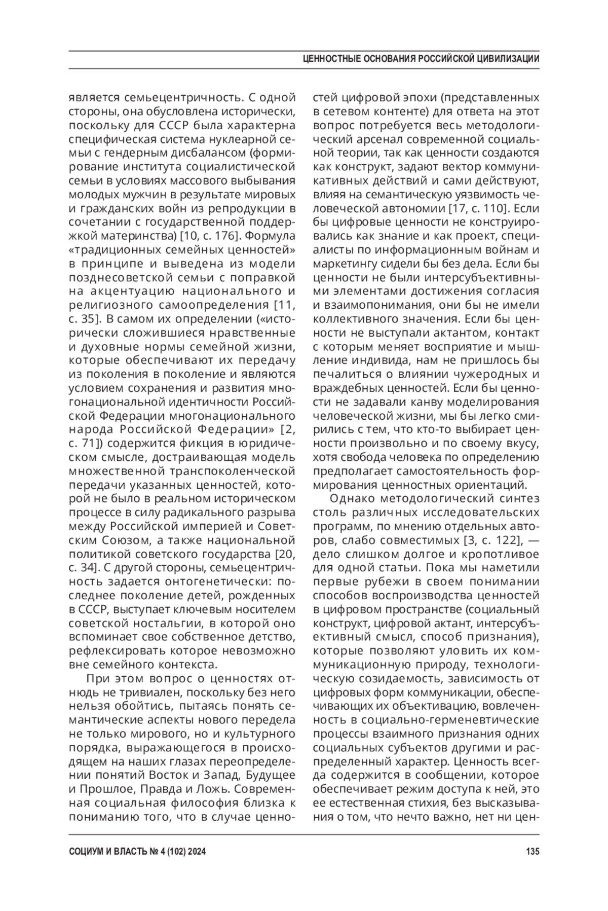 Введение. Сегодня, в эпоху радикальных геополитических столкновений, вопрос о ценностных основаниях укрепления и развития российского государства и общества встает с особой остротой. Авторы статьи исходят из того, что специфика текущих социально-политических трансформаций может быть описана в терминах цивилизационного противостояния или «цивилизационной войны».