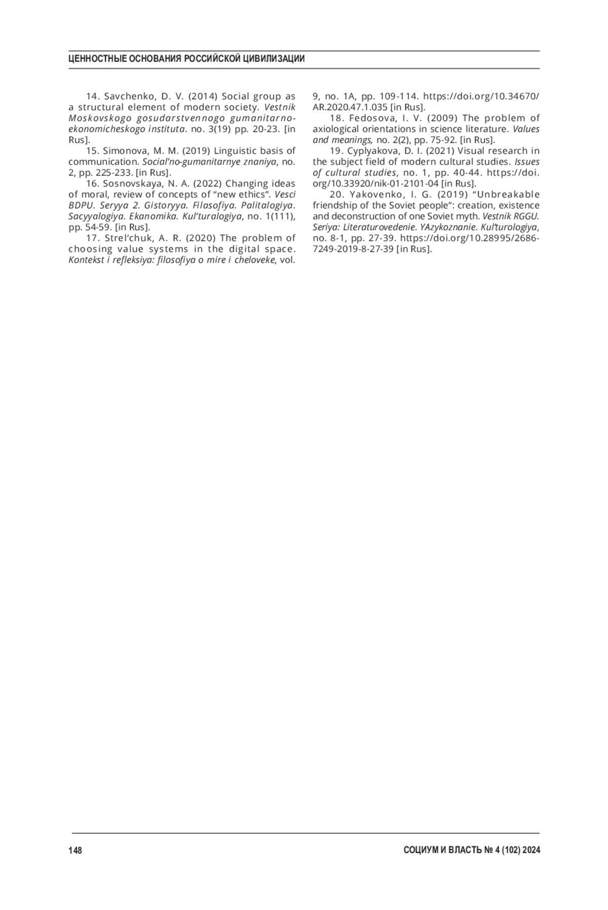 17. 	Стрельчук, А. Р. Проблема выбора ценностных установок в цифровом пространстве / А. Р. Стрельчук // Контекст и рефлексия: философия о мире и человеке. - 2020. - Т. 9, № 1A. - С. 109-114.  DOI: 10.34670/AR.2020.47.1.035  EDN: HURTPI