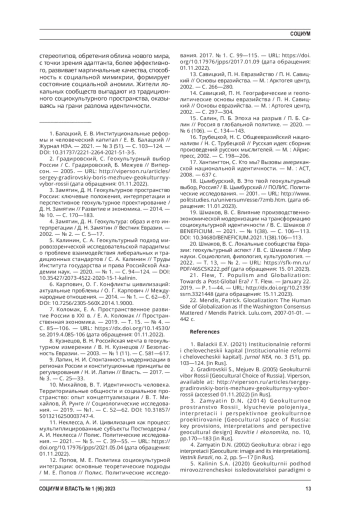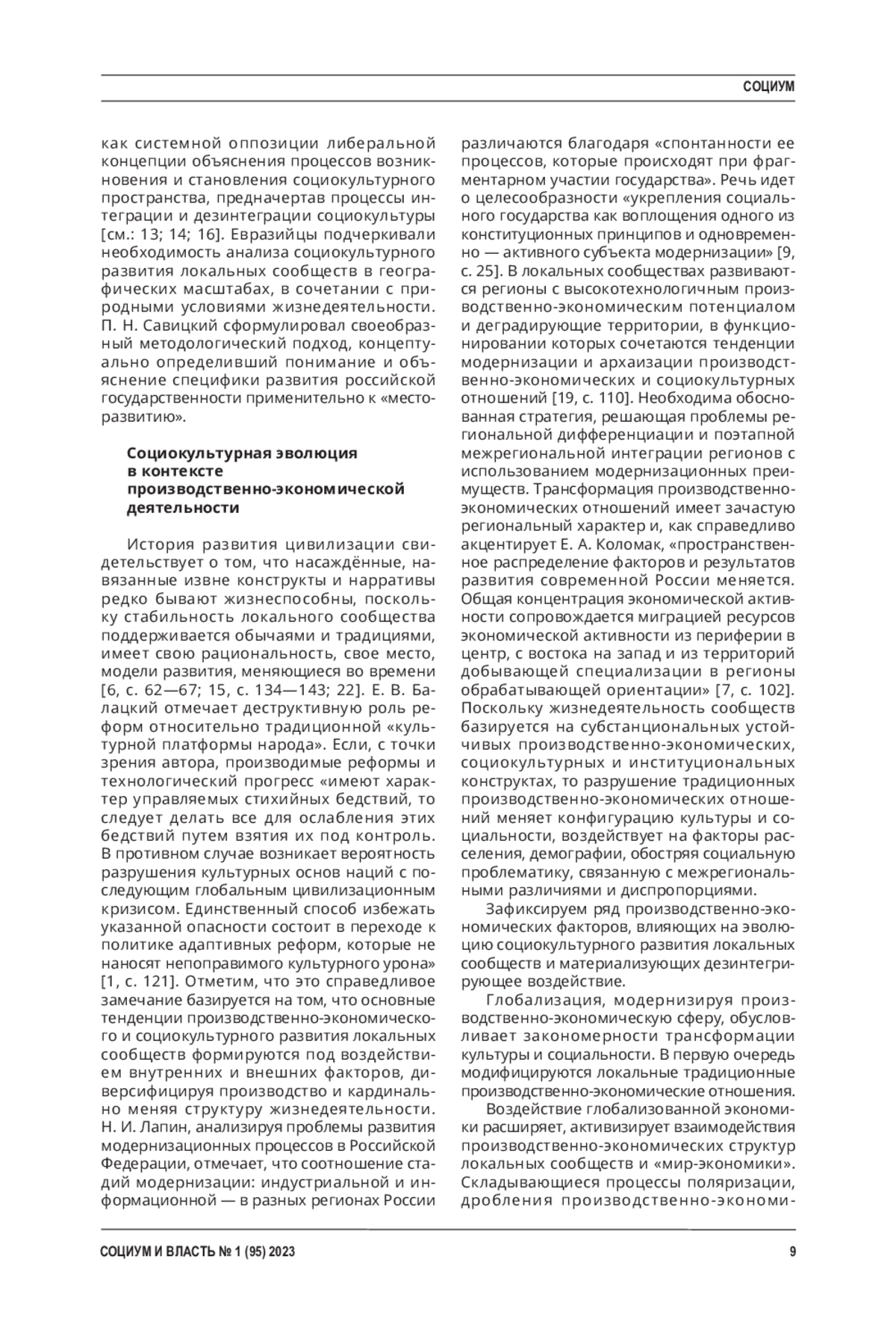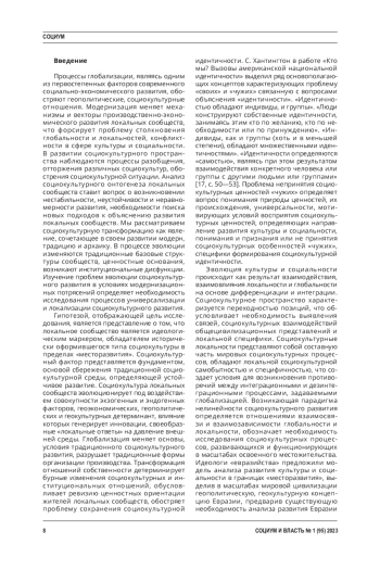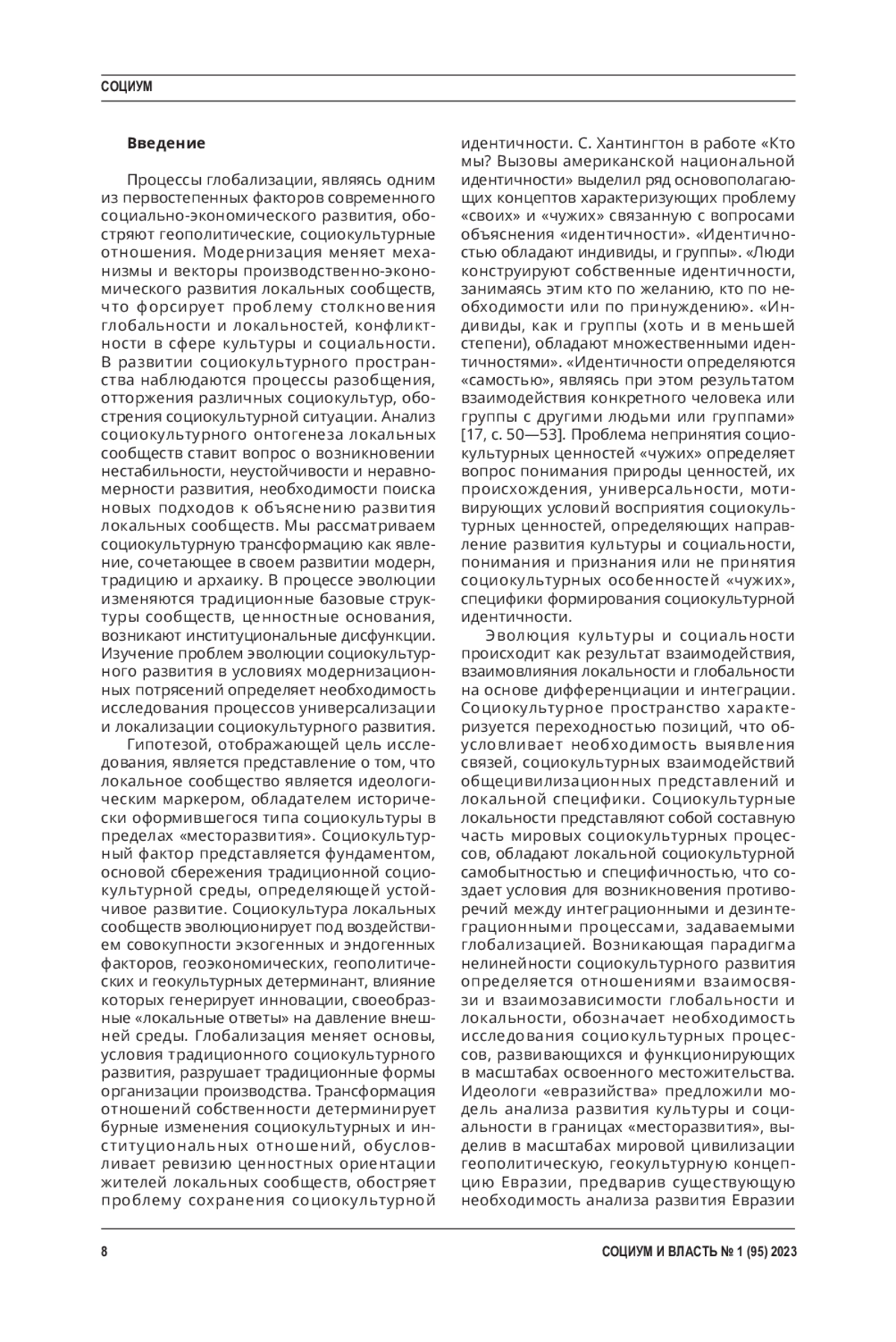 Выводы. Динамика социокультурных процессов детерминирует возникновение разнонаправленных полюсов социокультурной жизни: от стремления сохранить традиционную социокультурную среду до полного принятия содержательных качеств либеральной социокультуры, разрушающей социокультурную идентичность локальных сообществ.