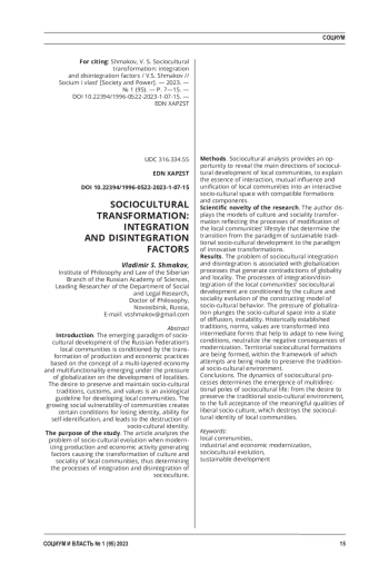 Результаты. Проблема социокультурной интеграции и дезинтеграции связана с глобализационными процессами, порождающими противоречия глобальности и локальности. Процессы интеграции/дезинтеграции социокультурного развития локальных сообществ обусловливаются эволюцией культуры и социальности конструирующей модели социокультурного поведения. Давление глобализации повергает социокультурное пространство в состояние диффузии, нестабильности. Исторически сложившиеся традиции, нормы, ценности преобразовываются в промежуточные формы, помогающие адаптироваться к новым условиям жизни, нивелировать негативные последствия модернизации. Складываются территориальные социокультурные образования, в рамках которых делаются попытки сберечь традиционную социокультурную среду.