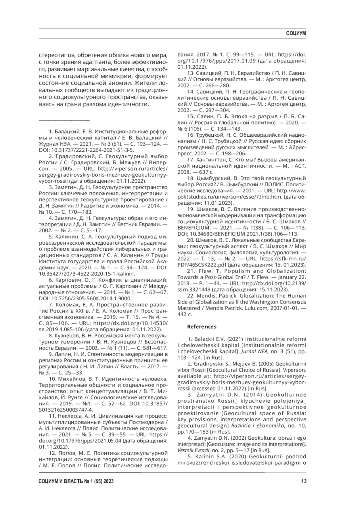12. 	Попов, М. Е. Политика социокультурной интеграции: основные теоретические подходы / М. Е. Попов // Полис. Политические исследования. 2017. № 1. С. 99-115. - 10.17976/jpps/2017.01.09 (дата обращения: 01.11.2022).  DOI: 10.17976/jpps/2017.01.09(  EDN: XRJTYH