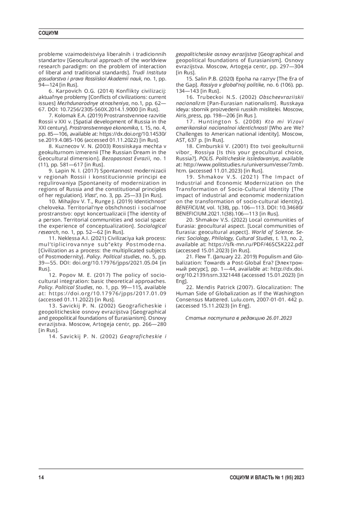 20. 	Шмаков, В. С. Локальные сообщества Евразии: геокультурный аспект / В. С. Шмаков // Мир науки. Социология, филология, культурология. - 2022. - Т. 13, - № 2. - URL: https://sfk-mn.ru/PDF/46SCSK222.pdf (дата обращения: 15.01.2023).  EDN: MARQBY