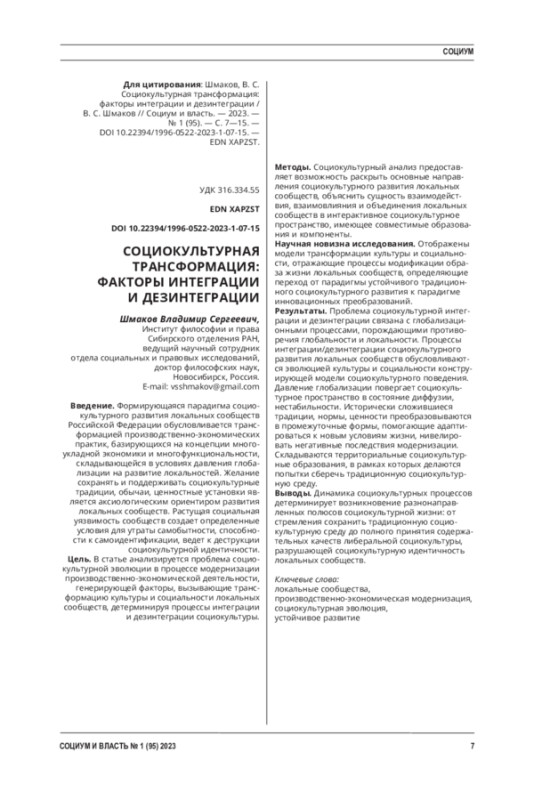 Цель. В статье анализируется проблема социокультурной эволюции в процессе модернизации производственно-экономической деятельности, генерирующей факторы, вызывающие трансформацию культуры и социальности локальных сообществ, детерминируя процессы интеграции и дезинтеграции социокультуры.