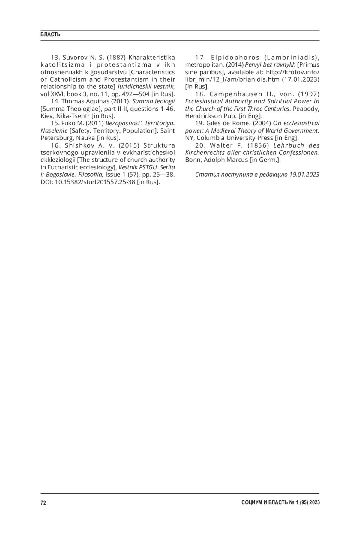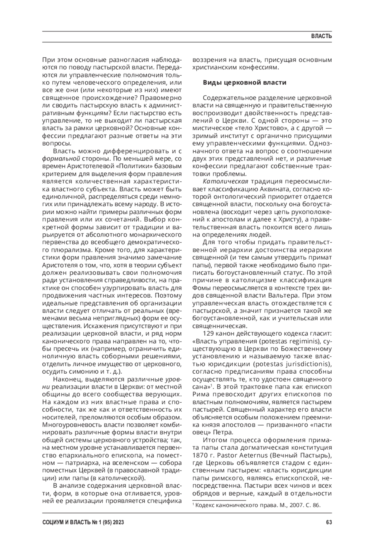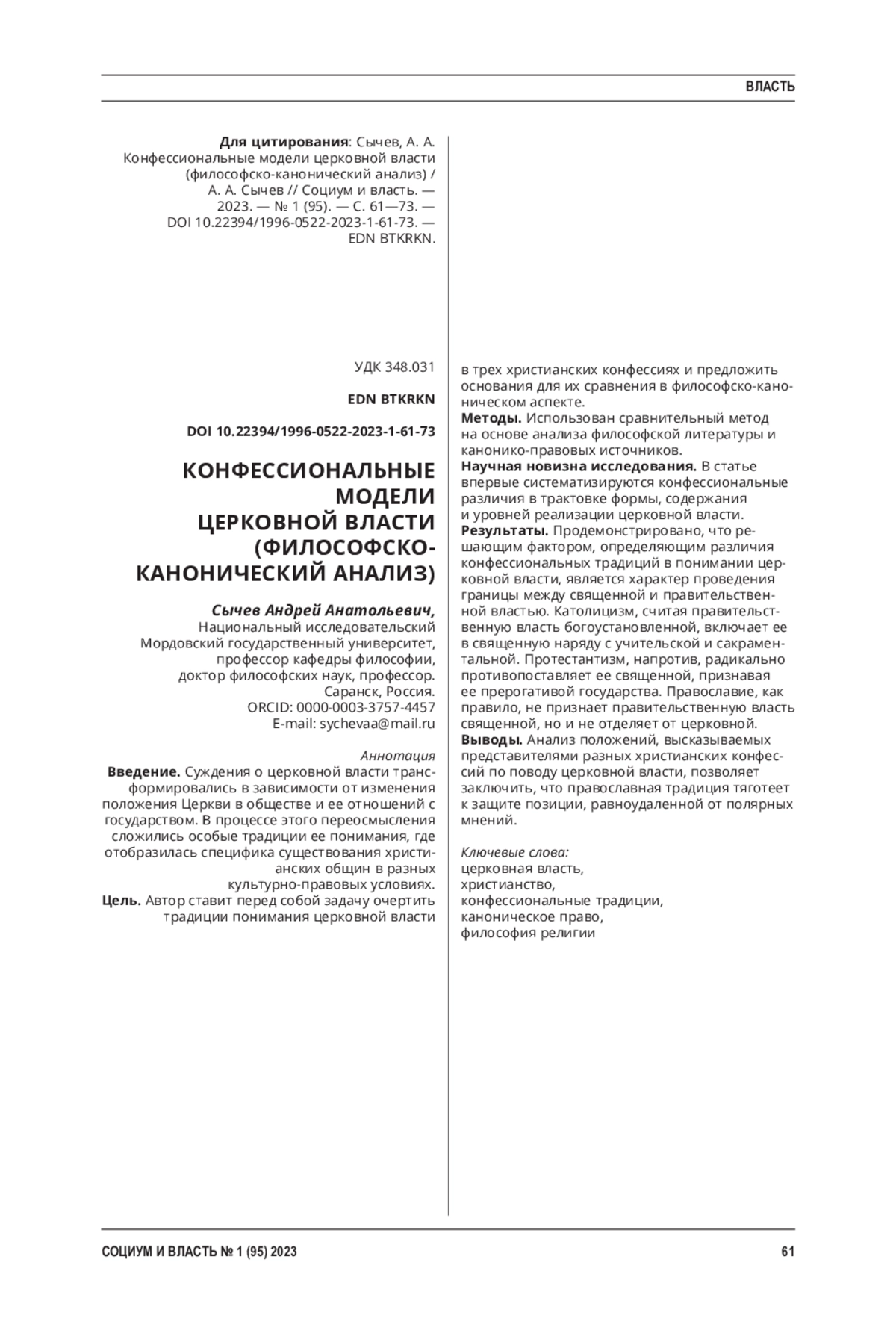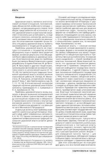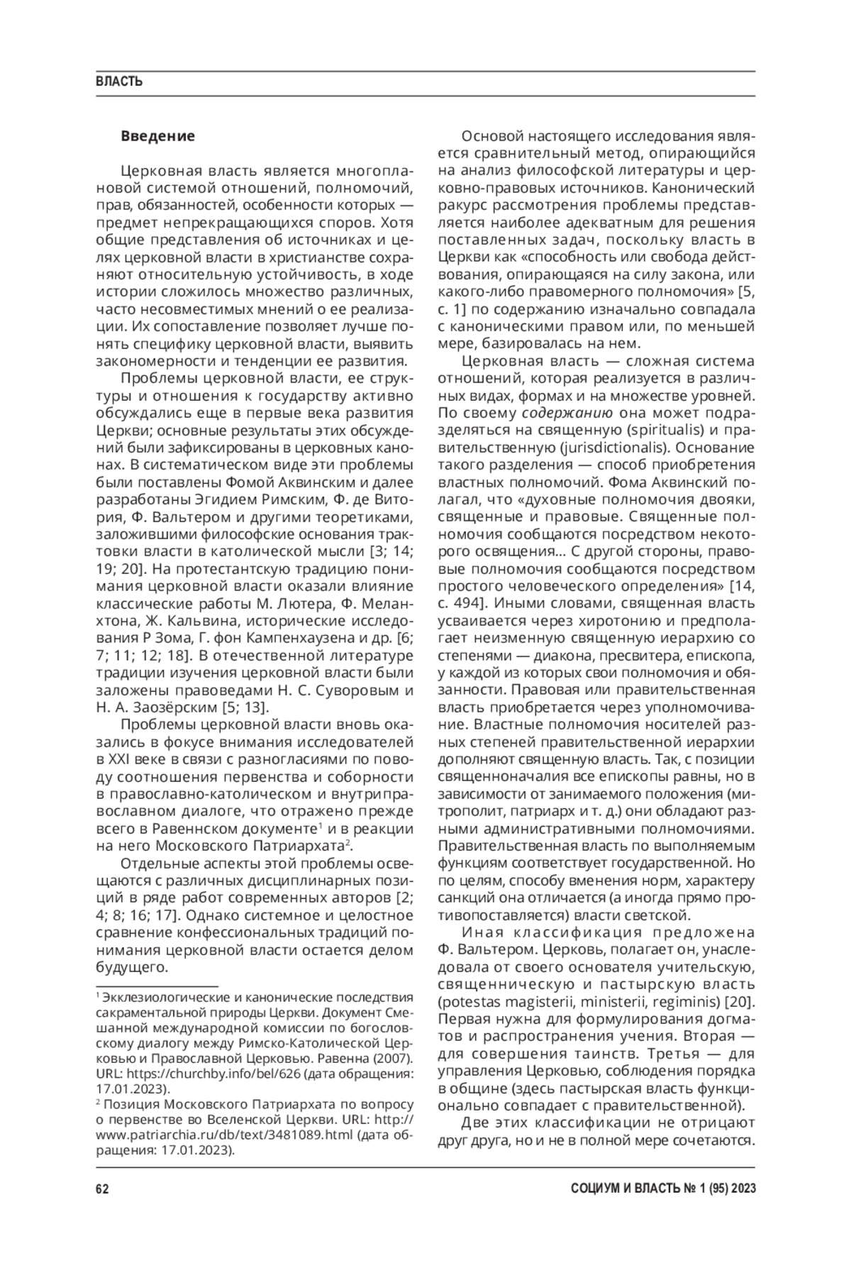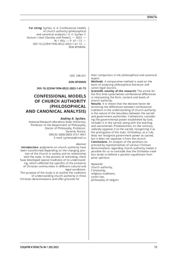 Введение. Суждения о церковной власти трансформировались в зависимости от изменения положения Церкви в обществе и ее отношений с государством. В процессе этого переосмысления сложились особые традиции ее понимания, где отобразилась специфика существования христианских общин в разных культурно-правовых условиях.